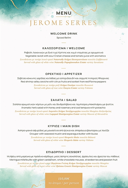 Ορεκτικό: σεβίτσε κόκκινης γαρίδας κοιλάδας με εσπεριδοειδή και σορμπέ πιπεριές Φλώρινας (συνοδεύεται από ποτήρι ροζέ Κτήμα Ουσύρα, ποικιλία Φωκιανό). Σαλάτα: σαλάτα αρωματικών χόρτων με μέλι και δενδρολίβανο και τεμπούρα μπακαλιάρου με φιστίκι (συνοδεύεται από ποτήρι λευκό κρασί Λαγοπάτι Κτήμα Χατζηγεωργίου, ποικιλία Μοσχάτο Αλεξανδρείας).