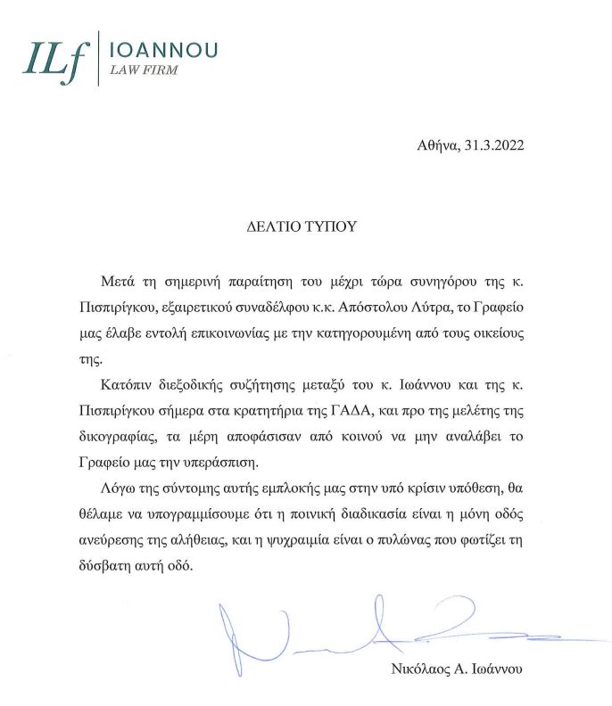 «Κατόπιν διεξοδικής συζήτησης μεταξύ του κ. Ιωάννου και της κ. Πισπιρίγκου σήμερα στα κρατητήρια της ΓΑΔΑ, και προ της μελέτης της δικογραφίας, τα μέρη αποφάσισαν από κοινού να μην αναλάβει το Γραφείο μας την υπεράσπιση».