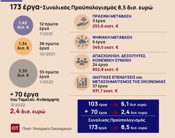 Πλέον, ο συνολικός προϋπολογισμός των 173 έργων που έχουν λάβει έγκριση διαμορφώνεται σε 8,5 δισ. Ευρώ. Σημειώνεται πως τον Ιούλιο του 2021 ανακοινώθηκαν τα πρώτα 12 έργα (1,42 δισ. ευρώ) που εντάχθηκαν στο Ταμείο, ακολούθησαν 36 έργα (1,34 δισ. ευρώ) τον Οκτώβριο του 2021 και ακόμη 55 (3,35 δισ. ευρώ) τον Ιανουάριο του 2022.