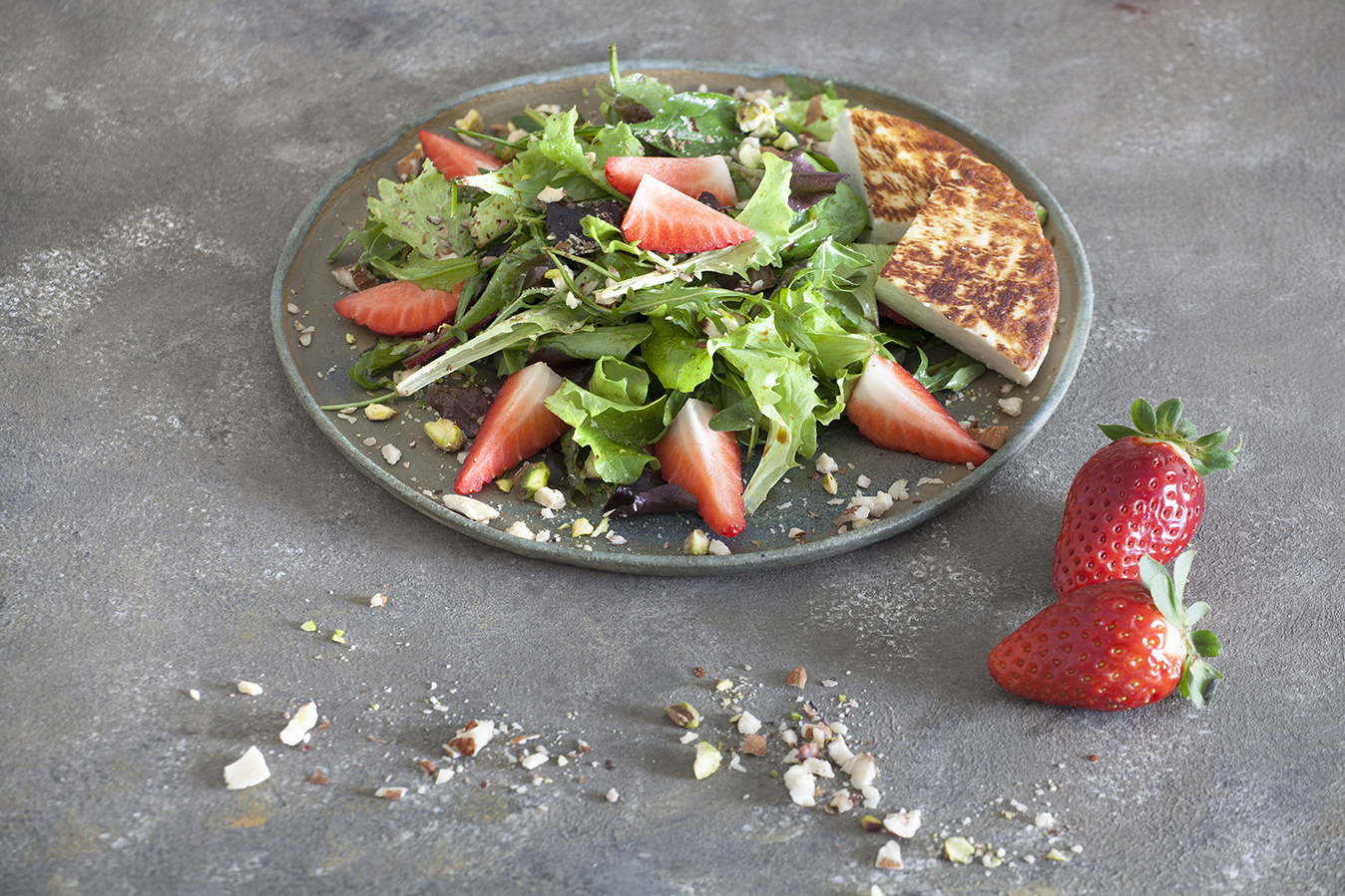 Στη συνέχεια ρίχνουμε την πράσινη σαλάτα μέσα στο ντρέσινγκ, ανακατεύουμε καλά και πασπαλίζουμε με λίγο αλάτι. Καθαρίζουμε τις φράουλες, τις πλένουμε και τις κόβουμε στα 4. Ψήνουμε στην ψηστιέρα το μανούρι για 2΄από την κάθε του πλευρά ή το περνάμε λίγο από το τηγάνι μέχρι να πιάσει κρούστα η επιφάνειά του.