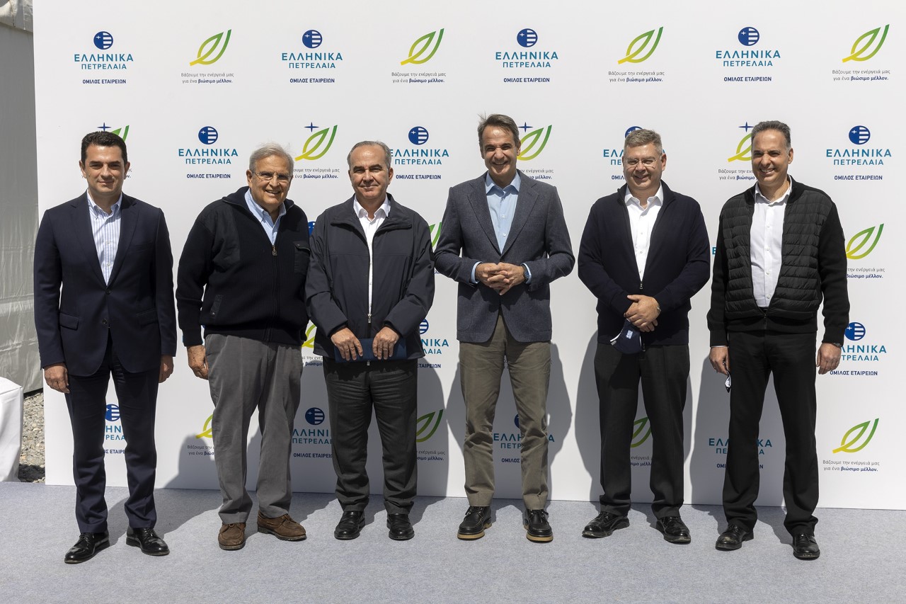 (Από αριστερά προς τα δεξιά), κ. Γιώργος Αλεξόπουλος Γενικός Διευθυντής Στρατηγικού Σχεδιασμού και Νέων Δραστηριοτήτων του Ομίλου ΕΛΛΗΝΙΚΑ ΠΕΤΡΕΛΑΙΑ, κ. Ανδρέας Σιάμισιης Διευθύνων Σύμβουλος του Ομίλου ΕΛΛΗΝΙΚΑ ΠΕΤΡΕΛΑΙΑ, κ. Κώστας Σκρέκας Υπουργός Περιβάλλοντος και Ενέργειας, κ. Γιάννης Παπαθανασίου Πρόεδρος του Διοικητικού Συμβουλίου του Ομίλου ΕΛΛΗΝΙΚΑ ΠΕΤΡΕΛΑΙΑ και δεξιά ο Πρωθυπουργός κ. Κυριάκος Μητσοτάκης