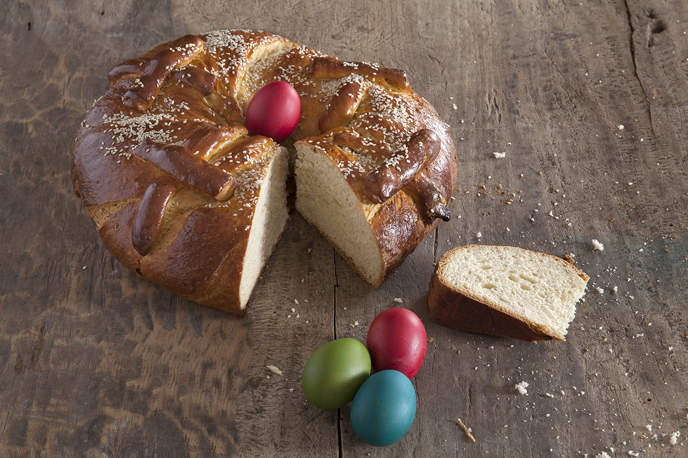 Αφού περάσουν τα 20 λεπτά, παίρνουμε τη ζύμη, τη ζυμώνουμε λίγο και κόβουμε 150 γρ., τα οποία χωρίζουμε στα δύο. Πλάθουμε 4 μακρόστενα φυτίλια για να φτιάξουμε τους σταυρούς που στολίζουν το Πασχαλόψωμο.
