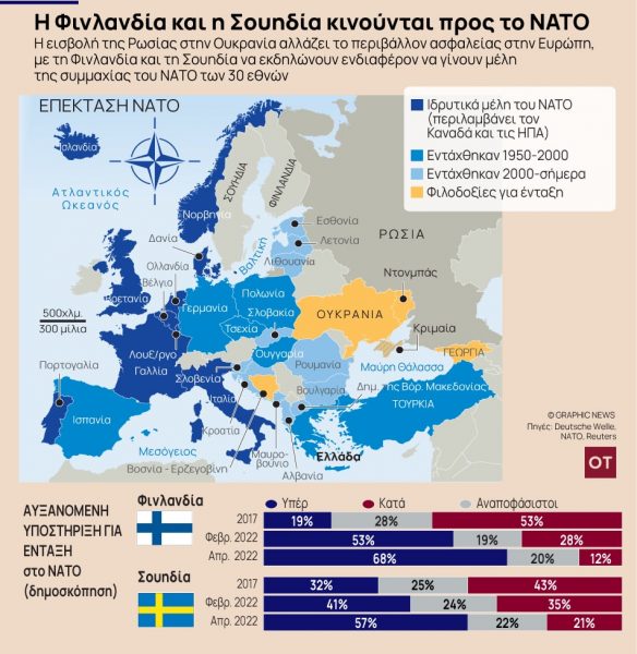 Σημειωτέον πως χθες στο κοινοβούλιο της γειτονικής Φινλανδίας ξεκίνησε η συζήτηση για τη δημιουργία ενός νέου πλαισίου ασφαλείας, μια συζήτηση που θα κρατήσει αρκετές ημέρες και αναπόφευκτα θα επεκταθεί και στο ζήτημα μιας πιθανής αίτησης για ένταξη στη Συμμαχία. Μια τέτοια αίτηση θα μπορούσε να υποβληθεί μέσα στις επόμενες εβδομάδες με στόχο να τεθεί επί τάπητος στη σύνοδο της Συμμαχίας, τον Ιούνιο.