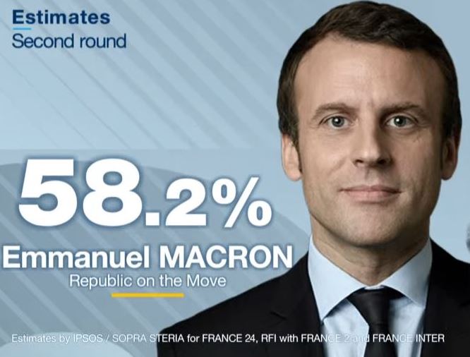 Η τηλεόραση TF1 δίνει νίκη του Εμανουέλ Μακρόν με ποσοστό 58 % έναντι 42% της Λεπέν.