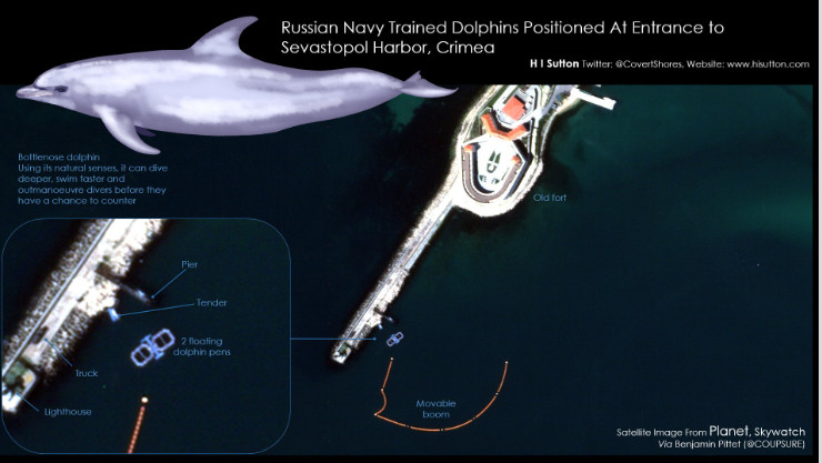 Το Ναυτικό Ινστιτούτο των ΗΠΑ (USNI) εξέτασε δορυφορικές εικόνες της ναυτικής βάσης στο λιμάνι της Σεβαστούπολης και κατέληξε στο συμπέρασμα ότι δύο ομάδες δελφινιών μεταφέρθηκαν στη βάση τον Φεβρουάριο, κατά την έναρξη της εισβολής της Μόσχας στην Ουκρανία.
