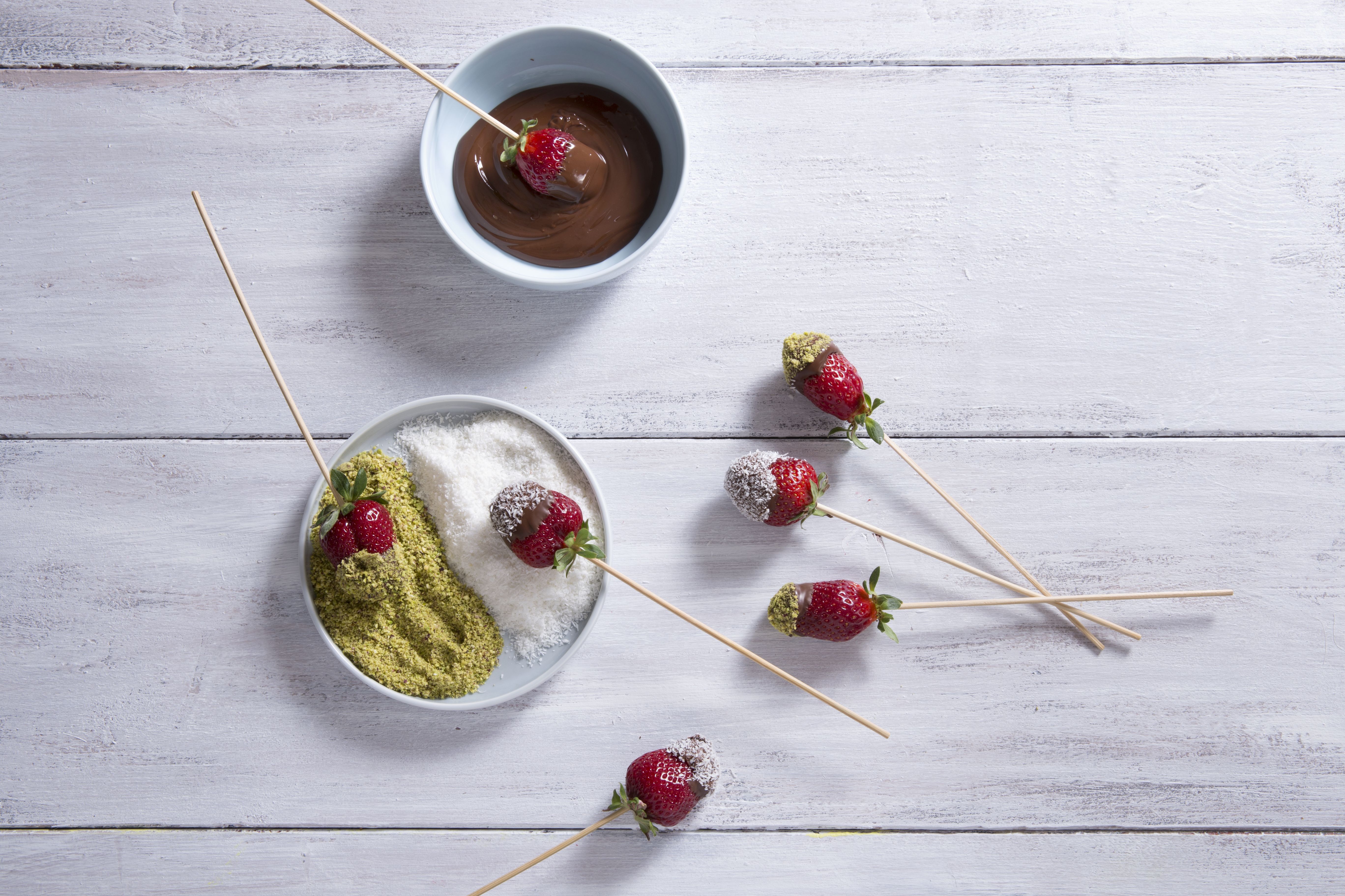Αποσύρουμε από τη φωτιά και αφήνουμε 1-2 λεπτά να κρυώσει λίγο. Καρφώνουμε κάθε φράουλα σε ένα καλαμάκι. Κρατώντας από το καλαμάκι βουτάμε την άκρη από τις φράουλες στη σοκολάτα και στη συνέχεια βουτάμε στην καρύδα, στο φιστίκι κ.τ.λ.