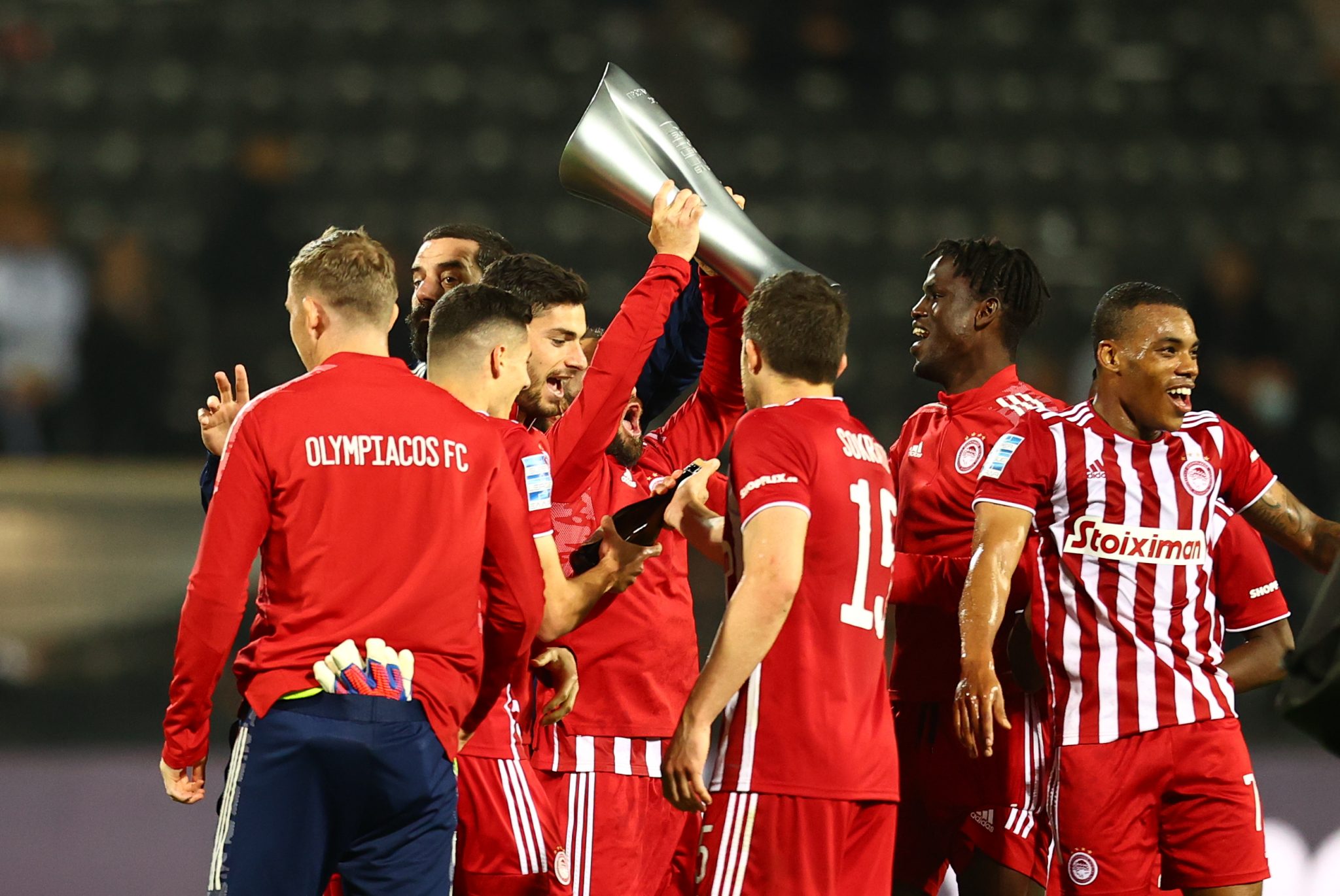 Με το σφύριγμα της λήξης οι παίκτες αλλά και ο πάγκος του Ολυμπιακού ξέσπασαν σε πανηγυρισμούς στήνοντας πάρτι στον αγωνιστικό χώρο της Τούμπας. Οι σαμπάνιες είχαν την τιμητική τους, ενώ οι παίκτες των Πειραιωτών σήκωσαν στα χέρια τον Πέδρο Μαρτίνς που δεν μπορούσε να κρύψει τη χαρά του για την κατάκτηση του πρωταθλήματος.