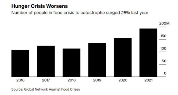 Οι συγκρούσεις, οι οικονομικές κρίσεις και τα ακραία καιρικά φαινόμενα είχαν ως αποτέλεσμα να αυξηθεί ο αριθμός των ανθρώπων που αντιμετωπίζουν επισιτιστικές κρίσεις κατά ένα πέμπτο, φθάνοντας τον περασμένο χρόνο τα 193 εκατομμύρια, δηλαδή σχεδόν 40 εκατομμύρια άνθρωποι περισσότεροι σε σχέση με το 2020 ή αύξηση 20% και η κατάσταση θα επιδεινωθεί χωρίς την επείγουσα ανάληψη δράσης «σε μαζική κλίμακα», όπως ανακοίνωσε μια ανθρωπιστική υπηρεσία.