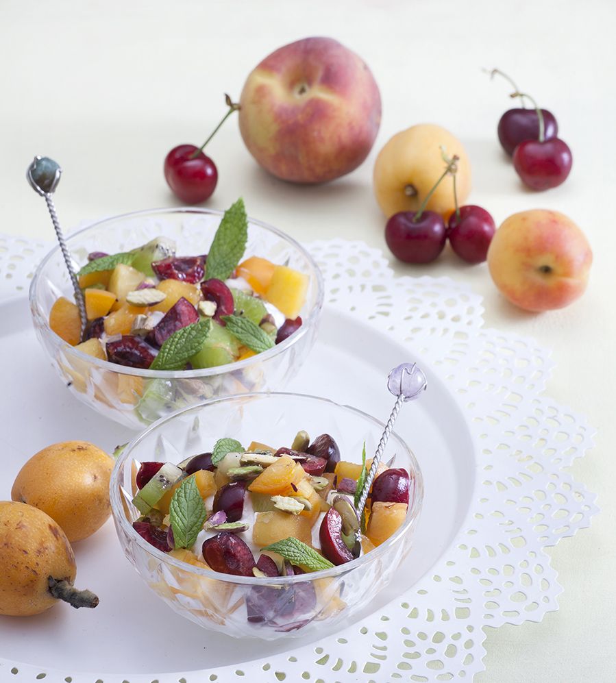 Κόβουμε τα φρούτα και τα ανακατεύουμε όλα μαζί σε ένα μπολ μαζί με τα φύλλα δυόσμου και 200 ml σιρόπι μαστίχας (το υπόλοιπο το φυλάμε για επόμενη φορά – διατηρείται στο ψυγείο σε γυάλινο δοχείο για αρκετές ημέρες). Μοιράζουμε το γιαούρτι σε δύο μπολ, στο καθένα τους προσθέτουμε από μισή φρουτοσαλάτα και περιχύνουμε με το σιρόπι.