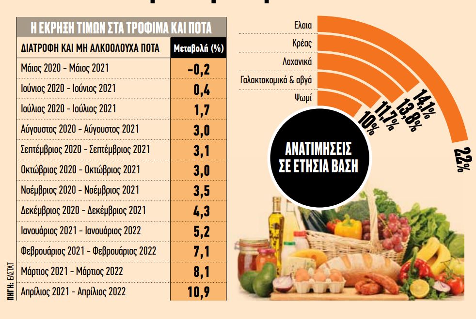 Με βάση τα στοιχεία της Ελληνικής Στατιστικής Αρχής (ΕΛΣΤΑΤ) προκύπτει ότι ο δείκτης τιμών στην ομάδα «Διατροφή και μη αλκοολούχα ποτά» εκτινάχθηκε σε ετήσια βάση τον Απρίλιο πάνω από τον μέσο πληθωρισμό στο 10,9%, όταν τον Ιούλιο πέρσι είχε αυξηθεί κατά 1,7%.