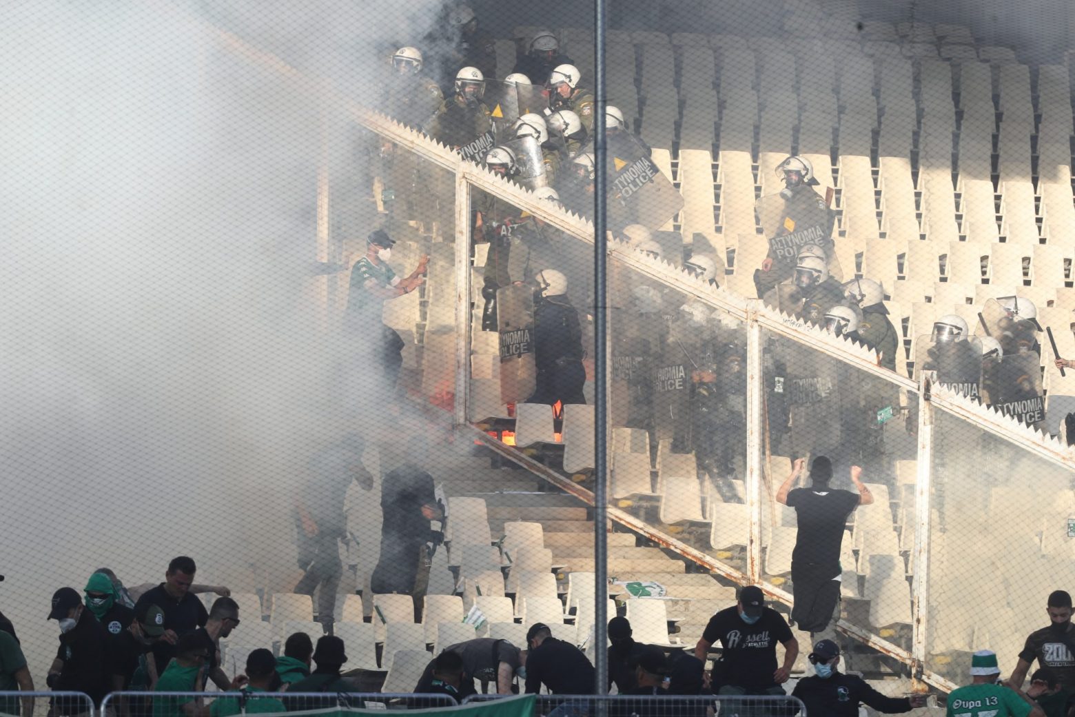 Το σκηνικό βίας στο ΟΑΚΑ ξεκίνησε μια ώρα πριν από την έναρξη του τελικού και συνεχίστηκε καθ’ όλη την διάρκεια του πρώτου ημιχρόνου.
