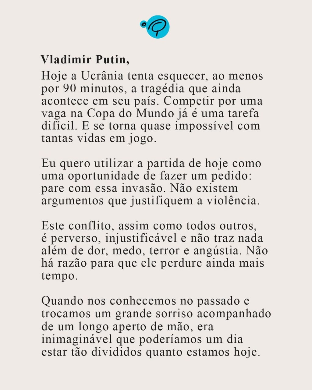 Ο Πελέ στην επιστολή που έστειλε στον Ρώσο πρόεδρο, ανάμεσα σε άλλα, σημειώνει ότι: «Οι πόλεμοι υπάρχουν μόνο για να διαιρούν τα έθνη και καμιά ιδεολογία δεν δικαιολογεί τη ρίψη πυραύλων που καταστρέφουν τα όνειρα των παιδιών, καταστρέφουν οικογένειες και σκοτώνουν αθώους».