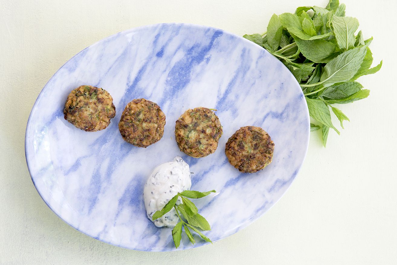 Πλάθουμε τους κεφτέδες, τους πιέζουμε να γίνουν πλακέ 1 εκ. και τους αλευρώνουμε. Σε ένα βαρύ τηγάνι βάζουμε ένα δάχτυλο ελαιόλαδο και τηγανίζουμε για 5΄.