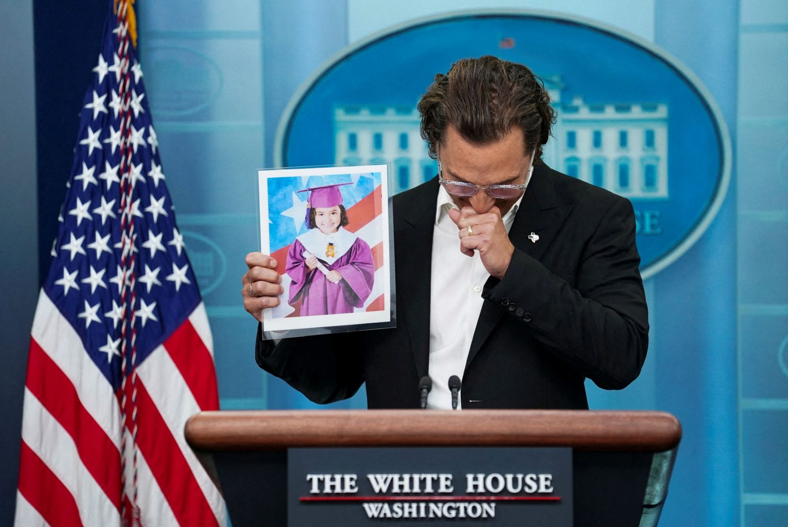 Ο 52χρονος ηθοποιός εμφανίστηκε στην ενημέρωση των δημοσιογράφων, κρατώντας φωτογραφίες ορισμένων από τα παιδιά που σκοτώθηκαν στο Ουβάλντε. Μίλησε για τις οικογένειές τους, τι φορούσαν την ημέρα που δολοφονήθηκαν και τι ήθελαν να γίνουν όταν θα μεγάλωναν. Αρκετές φορές έμοιαζε σαν να έχει έναν κόμπο στον λαιμό ενώ χτύπησε τη γροθιά του στο τραπέζι τη στιγμή που διάβαζε τα βιογραφικά στοιχεία των θυμάτων.