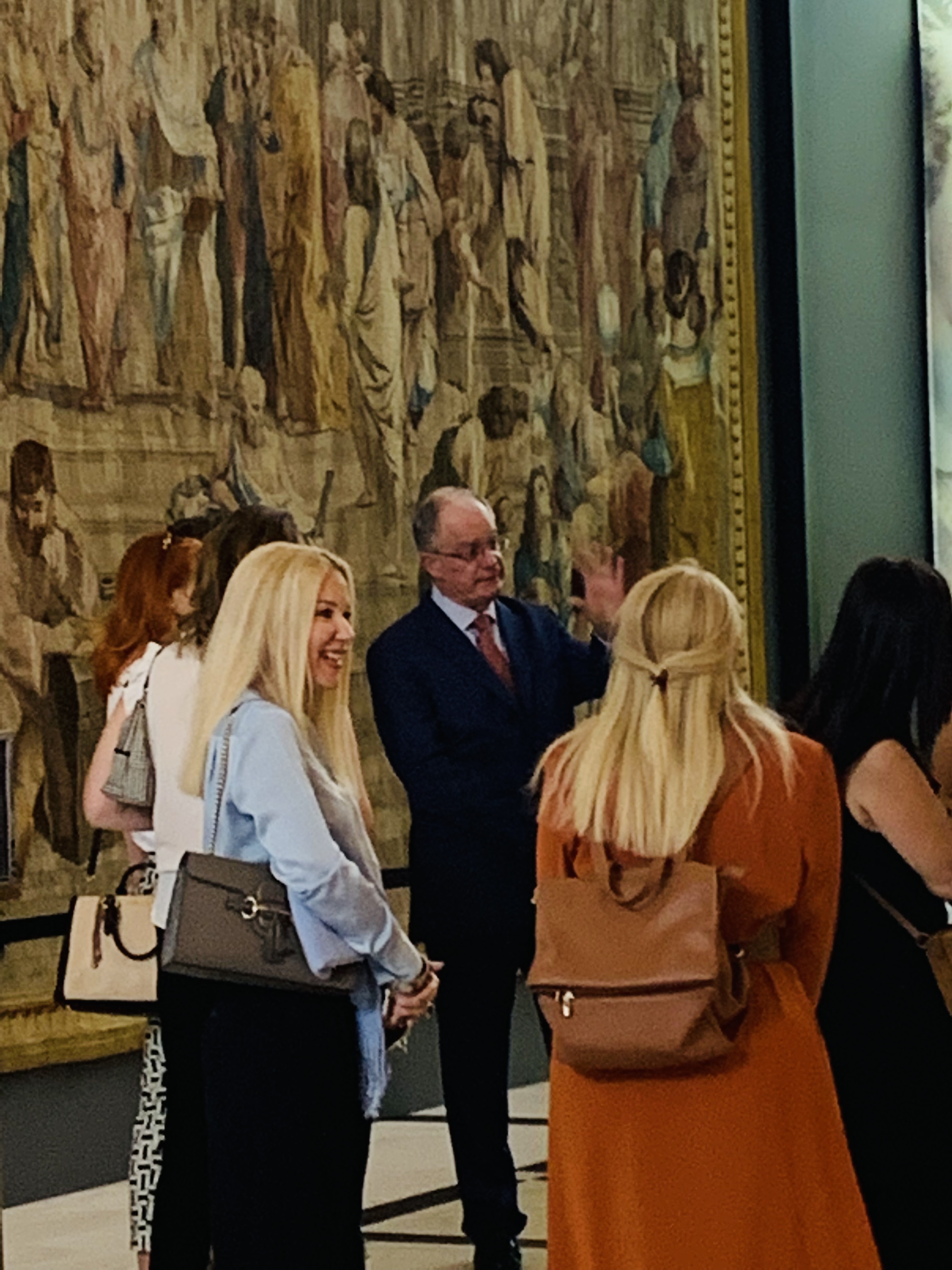 Έως τώρα τη Βουλή επισκέπτονταν σχολεία, σωματεία, ομογενείς, συνδικαλιστές, αλλά ποτέ ομάδες φίλων. Και όμως συνέβη και αυτό. Μια ομάδα 15 νέων γυναικών (που δεν είναι ούτε συμμαθήτριες, ούτε συνάδελφοι, ούτε γειτόνισσες), απλά φίλες, βρέθηκαν στη Βουλή και ξεναγήθηκαν. Σε κάποια στιγμή χρέη ξεναγού ανέλαβε και ο Πρόεδρος της Βουλής Κώστας Τασούλας και εξηγούσε στις φίλες την ιστορία της ταπισερί της «Σχολής των Αθηνών», που αποτελεί έναν εθνικό θησαυρό της Γαλλίας και που απεικονίζει τους μεγάλους φιλοσόφους της ελληνικής αρχαιότητας. Οι φίλες έβγαλαν φωτογραφίες μαζί με τον Πρόεδρο της Βουλής