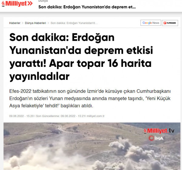«Ο Ερντογάν προκάλεσε σεισμό στην Ελλάδα!» υποστηρίζει η Μιλλιέτ, για να προσθέσει ότι η Αθήνα «κυκλοφόρησε βιαστικά 16 χάρτες», αναφερόμενη στη δημοσιοποίηση των χαρτών της τουρκικής προκλητικότητας από το υπουργείο Εξωτερικών.