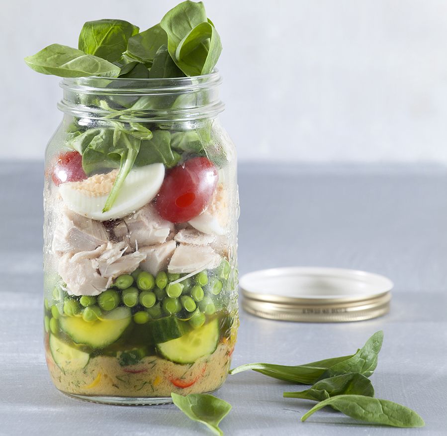 Ελέγχουμε ότι το βάζο είναι καθαρό και στεγνό. Πρώτα βάζουμε το ντρέσινγκ, στη συνέχεια τις πιπεριές και από πάνω το αγγούρι. Συνεχίζουμε με τον αρακά, μετά με το κοτόπουλο, το αβγό, τα ντοματίνια και, τέλος, «σφραγίζουμε» με το σπανάκι. Κλείνουμε το βάζο.