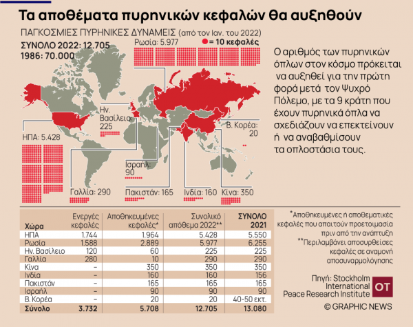 Σύμφωνα με το Ινστιτούτο Sipri, σήμερα υπάρχουν περί τις 12.700 βόμβες και πύραυλοι εξοπλισμένοι με πυρηνικές κεφαλές, ενώ το 1986 ο αντίστοιχος αριθμός ήταν 86.000 (αυτός ήταν και ο αριθμός-ρεκόρ). Η Ρωσία διαθέτει 5.977 πυρηνικές κεφαλές, 280 λιγότερες συγκριτικά με πέρυσι εξαιτίας της σταδιακής αποσυναρμολόγησης των πυραύλων που είχαν αποσυρθεί εδώ και χρόνια. Οι ΗΠΑ διαθέτουν 5.428 κεφαλές (-120), η Κίνα 350, η Γαλλία 290, η Βρετανία 225, το Πακιστάν 165, η Ινδία 160, το Ισραήλ 90 και η Βόρεια Κορέα «δίχως αμφιβολία διαθέτει 20», σύμφωνα με το Sipri.
