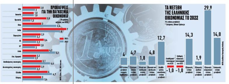 Παρά τους αντίθετους ανέμους καθώς το διεθνές περιβάλλον παραμένει ασταθές, τροφοδοτούμενο και από τη γεωπολιτική αβεβαιότητα και τη δυσλειτουργία στις αλυσίδες εφοδιασμού, οδηγώντας σε σπειροειδή αύξηση των τιμών των εμπορευμάτων και της ενέργειας και επιθετικές κινήσεις από τις κεντρικές τράπεζες για να τιθασεύσουν τον πληθωρισμό, η ελληνική οικονομία δείχνει να παρουσιάζει αντοχές εφέτος, υποστηριζόμενη από τη βελτίωση της ανεργίας, μια ισχυρή ανάκαμψη στον τουρισμό, αλλά και τις εισροές επενδύσεων, με την ανάπτυξη να εκτιμάται πλέον πως μπορεί να κινηθεί στην περιοχή του 4%.
