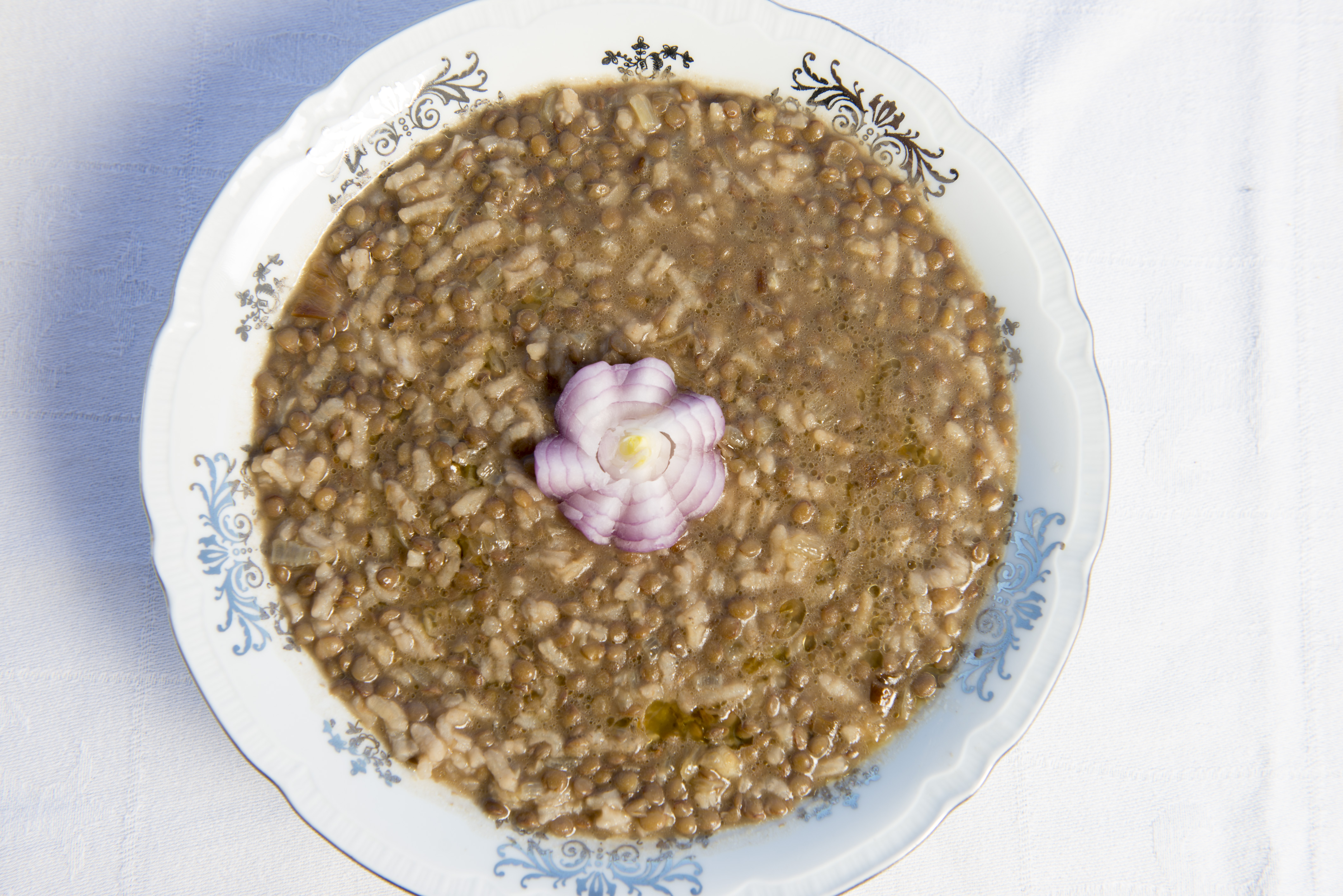 Καθαρίζουμε, αν χρειάζεται, τις φακές και τις ξεπλένουμε σε ένα σουρωτήρι. Ρίχνουμε το νερό με αλάτι σε μια κατσαρόλα, την οποία τοποθετούμε σε δυνατή φωτιά, μισοσκεπασμένη. Αφού πάρει βράση, προσθέτουμε τις φακές και ανακατεύουμε. Χαμηλώνουμε την ένταση της φωτιάς και μαγειρεύουμε τις φακές για 40 λεπτά. Τότε, προσθέτουμε το ρύζι, ανακατεύουμε και βράζουμε για 30 λεπτά. Περίπου 20 λεπτά προτού αποσύρουμε την κατσαρόλα από τη φωτιά, ρίχνουμε το ελαιόλαδο σε ένα τηγάνι. Το βάζουμε σε δυνατή φωτιά και μόλις κάψει προσθέτουμε το κρεμμύδι. Το τσιγαρίζουμε, να γίνει σκούρο καφέ, για 15-20 λεπτά, ανάλογα με το πόσο λάδι ή κρεμμύδι έχουμε βάλει. Αποσύρουμε την κατσαρόλα από τη φωτιά και ρίχνουμε μέσα το τσιγαρισμένο κρεμμύδι. Το φαγητό θα αρχίσει να τσιτσιρίζει. Ανακατεύουμε καλά και σερβίρουμε όσο είναι ζεστό.