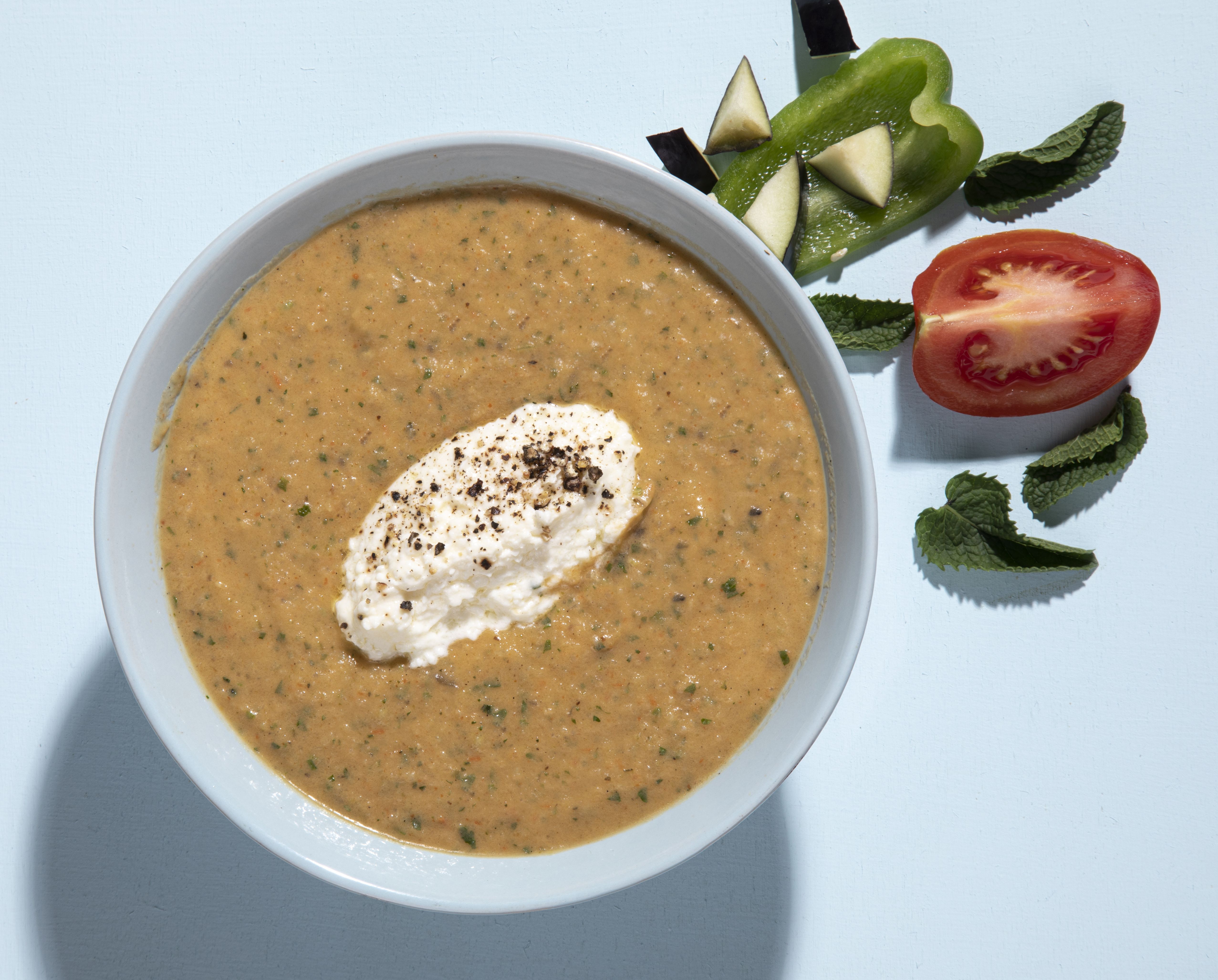Σερβίρουμε τη σούπα κρύα με κουταλιές από την κρέμα φέτας στο κέντρο.