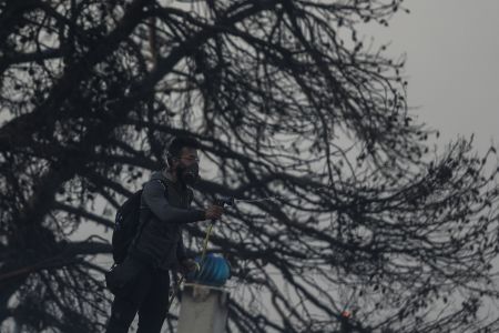 Όπως φαίνεται και από τις φωτογραφίες, ένας ηλικιωμένος κλείνει τα μάτια με τα χέρια του εξαιτίας του έντονου καπνού.