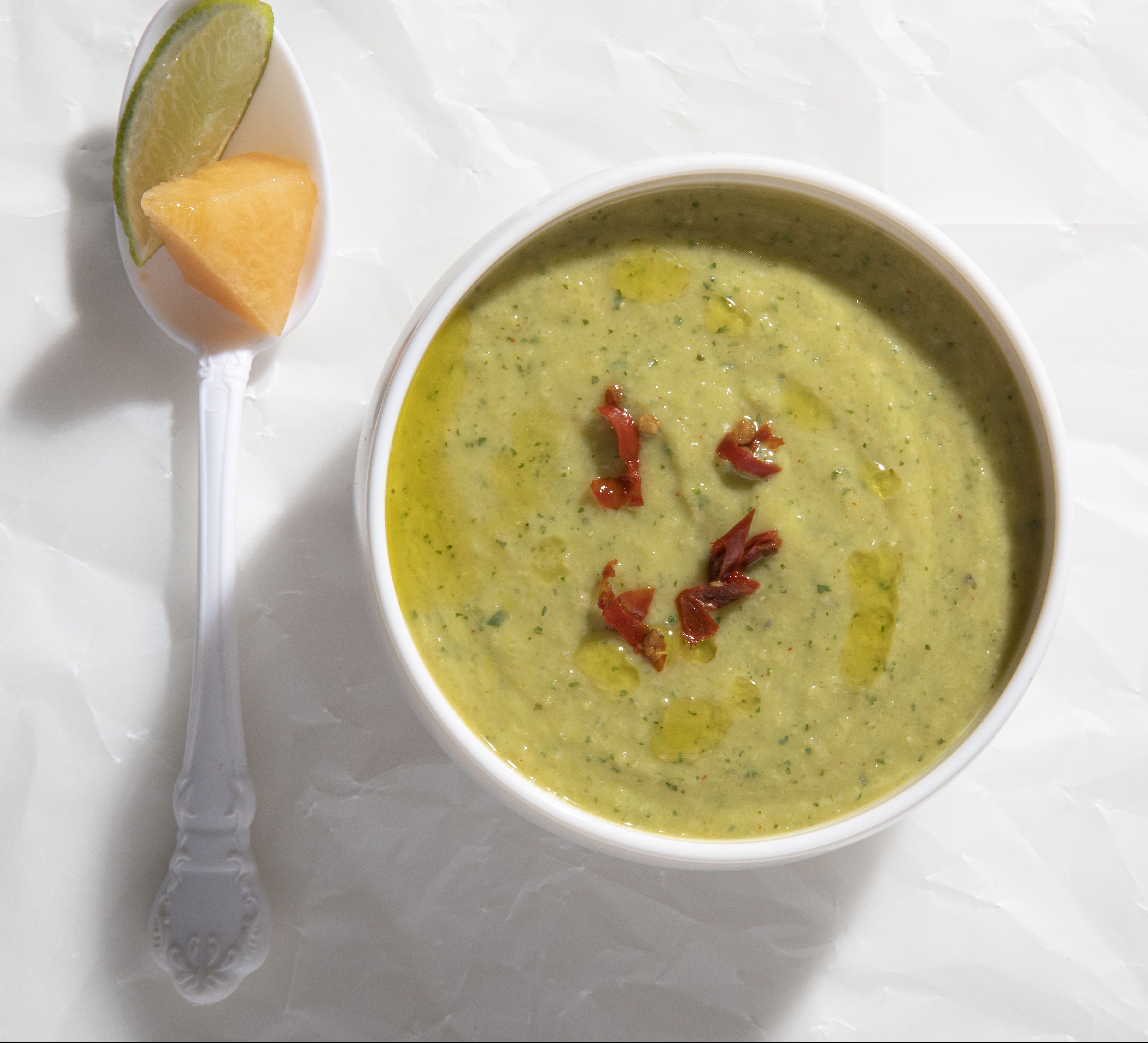 Καθαρίζουμε το πεπόνι, το αγγούρι και το αβοκάντο και τα κόβουμε σε μικρούς κύβους. Τα βάζουμε σε ένα μπλέντερ με τα υπόλοιπα υλικά και τα χτυπάμε μέχρι να ομογενοποιηθούν και να έχουμε ένα παχύρρευστο μείγμα.
