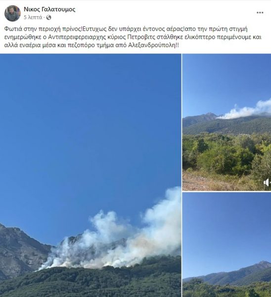 Με ανάρτησή του ο δήμαρχος του νησιού, Νίκος Γαλατούμος σημειώνει ότι αναμένονται ενισχύσεις σε εναέρια μέσα και πεζοπόρο τμήμα από την Αλεξανδρούπολη.