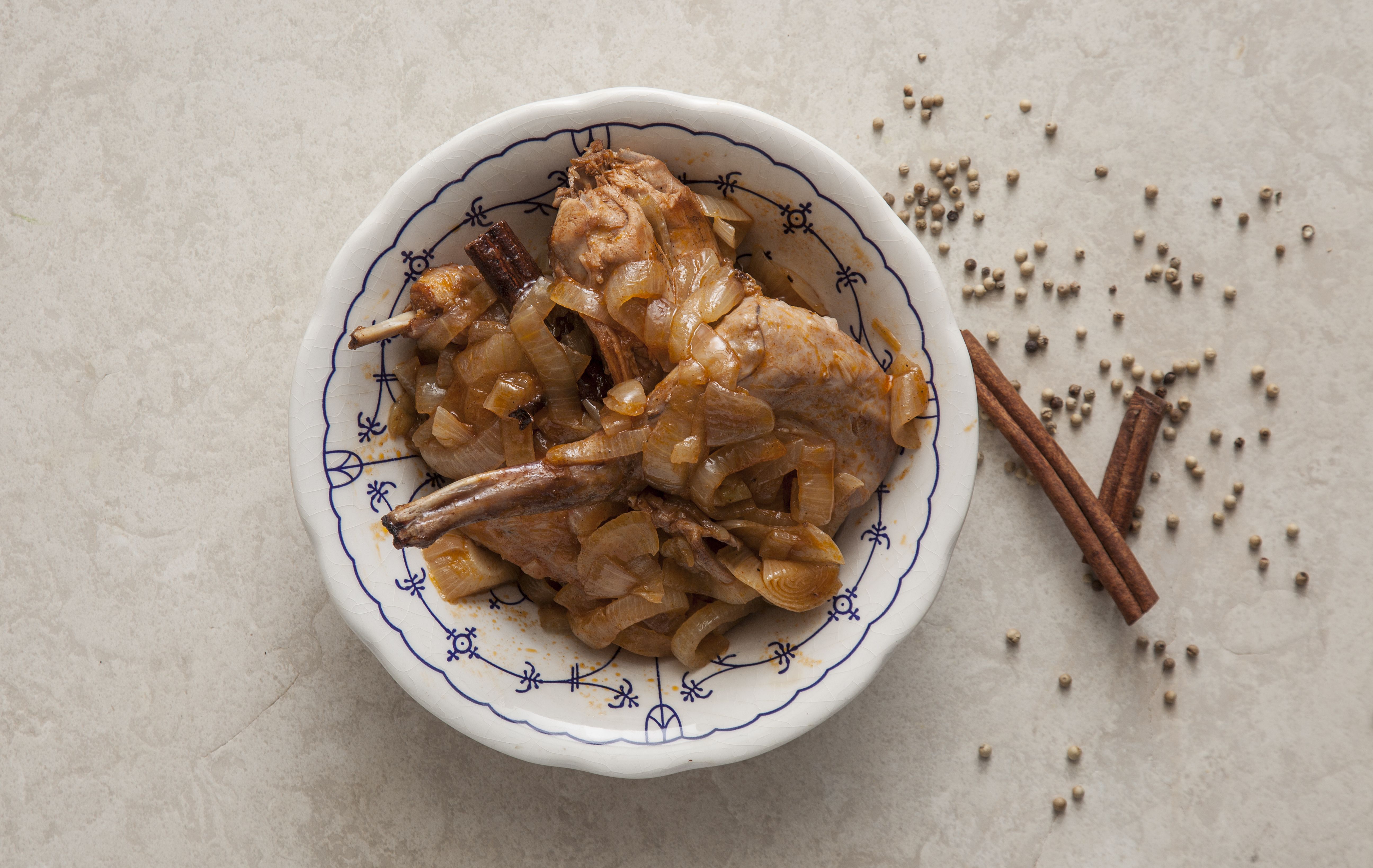 Σε μια φαρδιά κατσαρόλα ζεσταίνουμε το μισό ελαιόλαδο και τσιγαρίζουμε τα κομμάτια του κουνελιού μέχρι να πάρουν χρώμα. Παράλληλα σε μια δεύτερη κατσαρόλα ρίχνουμε το υπόλοιπο λάδι και τσιγαρίζουμε τα κρεμμύδια. Αυτά δεν πρέπει να πάρουν χρώμα, αλλά απλώς να μαραθούν. Προσθέτουμε τα κρεμμύδια στην κατσαρόλα με το κουνέλι, μαζί με την κανέλα, τα μοσχοκάρφια και την πάπρικα. Σβήνουμε με το κρασί και το αφήνουμε να εξατμιστεί για λίγο. Διαλύουμε τον πελτέ σε λίγο νερό, τον προσθέτουμε στο φαγητό και καλύπτουμε με νερό (ίσα που να σκεπάζει τα κομμάτια του κουνελιού). Σκεπάζουμε την κατσαρόλα και αφήνουμε το φαγητό να σιγοβράσει για μία ώρα περίπου ή ώσπου να μαλακώσει το κουνέλι.