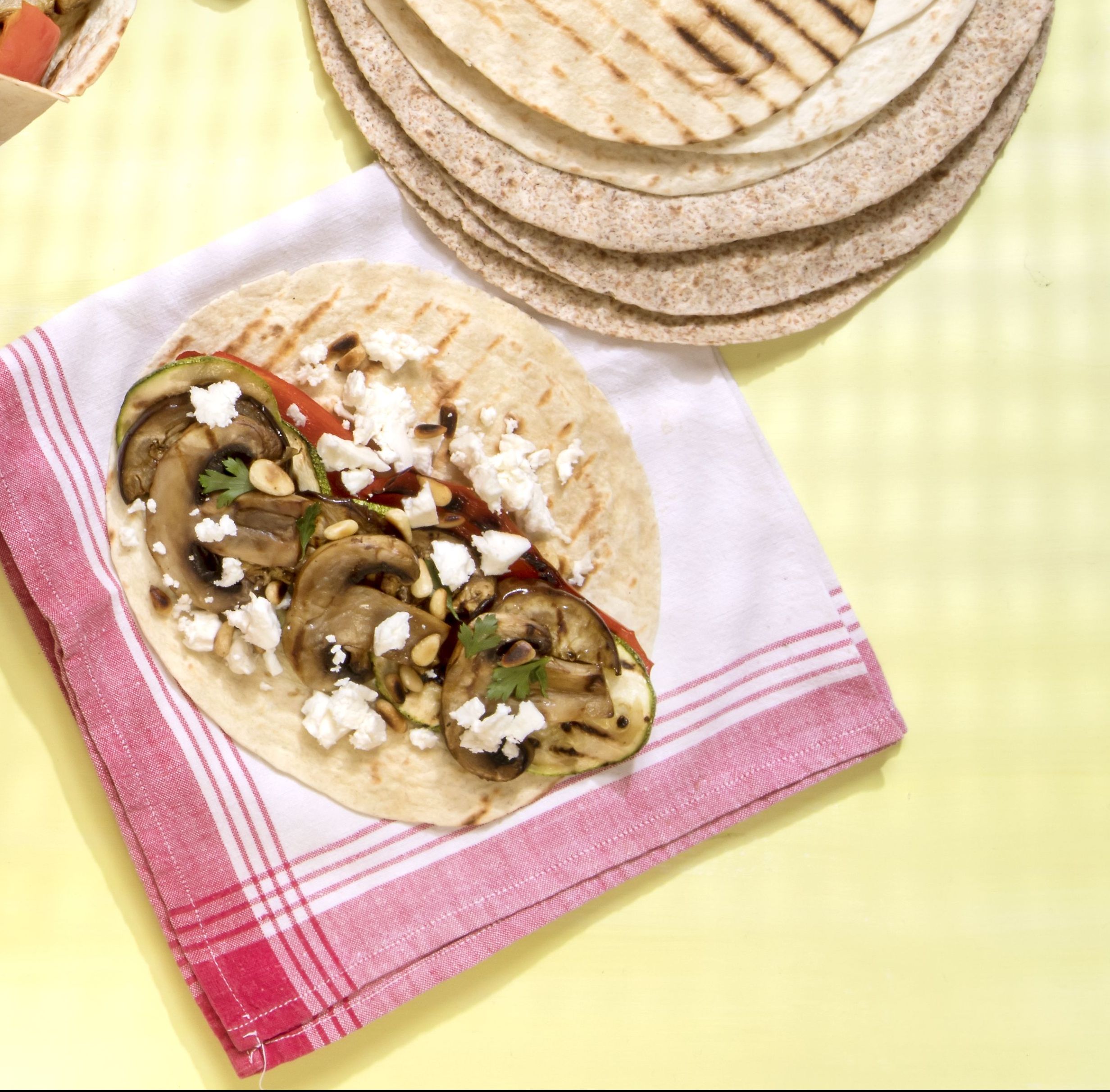 Βάζουμε τα λαχανικά σε ένα μπολ. Προσθέτουμε αλατοπίπερο, το λάδι και το μπαλσάμικο. Ανακατεύουμε με τα χέρια και τα αφήνουμε λίγο να μαριναριστούν. Βάζουμε ένα σχαροτήγανο σε δυνατή φωτιά και ψήνουμε τις τορτίγιες για λίγα δευτερόλεπτα από κάθε πλευρά μέχρι να ζεσταθούν και να σχηματιστούν γραμμές. Στο ίδιο τηγάνι ψήνουμε τα λαχανικά από τις δύο πλευρές μέχρι να σχηματιστούν γραμμές. Μπορούμε να τα ψήσουμε λιγότερο ή περισσότερο ανάλογα με τα γούστα μας.