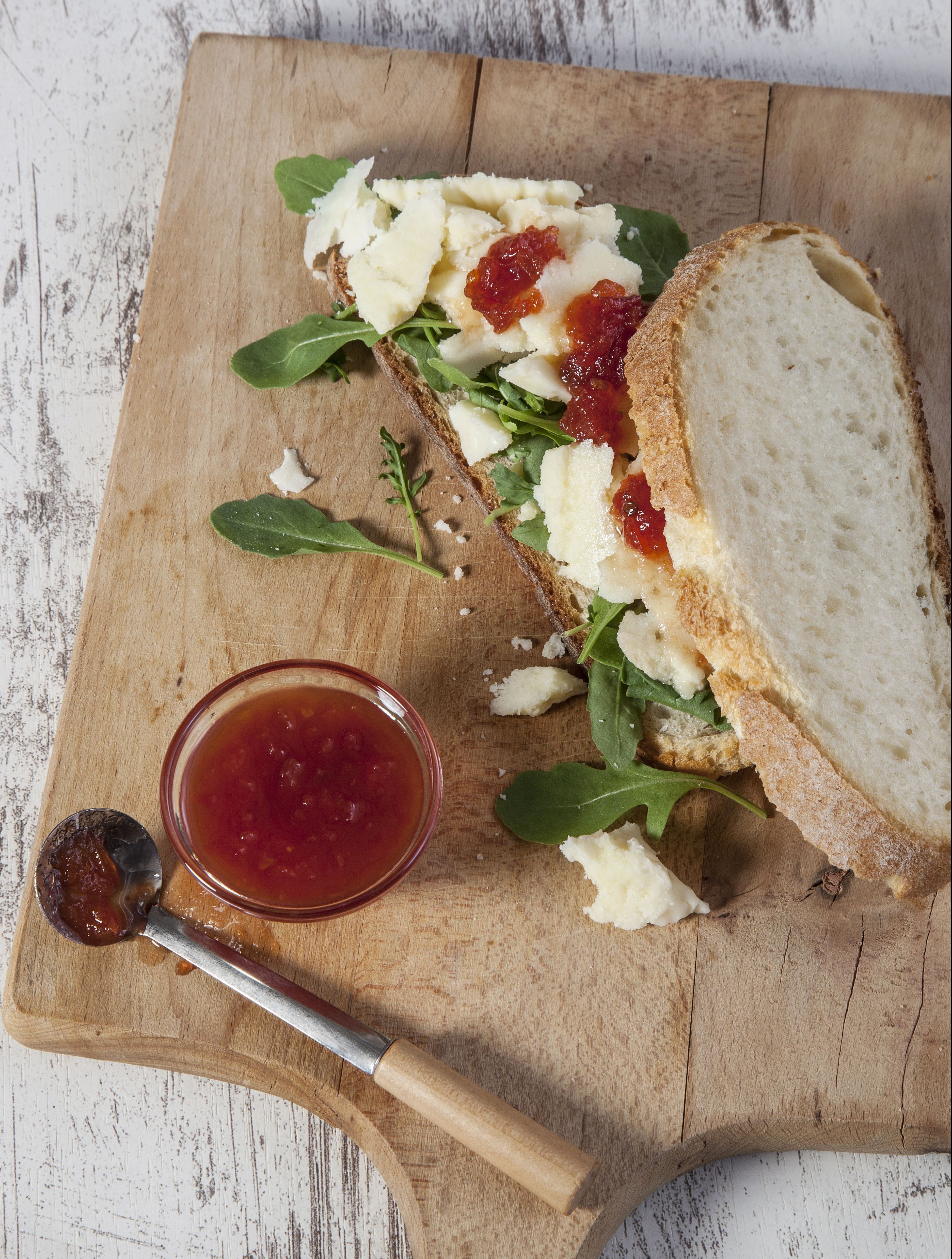 Βάζουμε τις 2 φέτες ψωμιού στην επιφάνεια εργασίας. Τις αλείφουμε πρώτα με μια λεπτή στρώση μαρμελάδας. Στη συνέχεια, μοιράζουμε πάνω τους τα φύλλα ρόκας και από πάνω τοποθετούμε τις φέτες του τυριού. Καλύπτουμε με την υπόλοιπη μαρμελάδα και κλείνουμε με τις υπόλοιπες 2 φέτες.