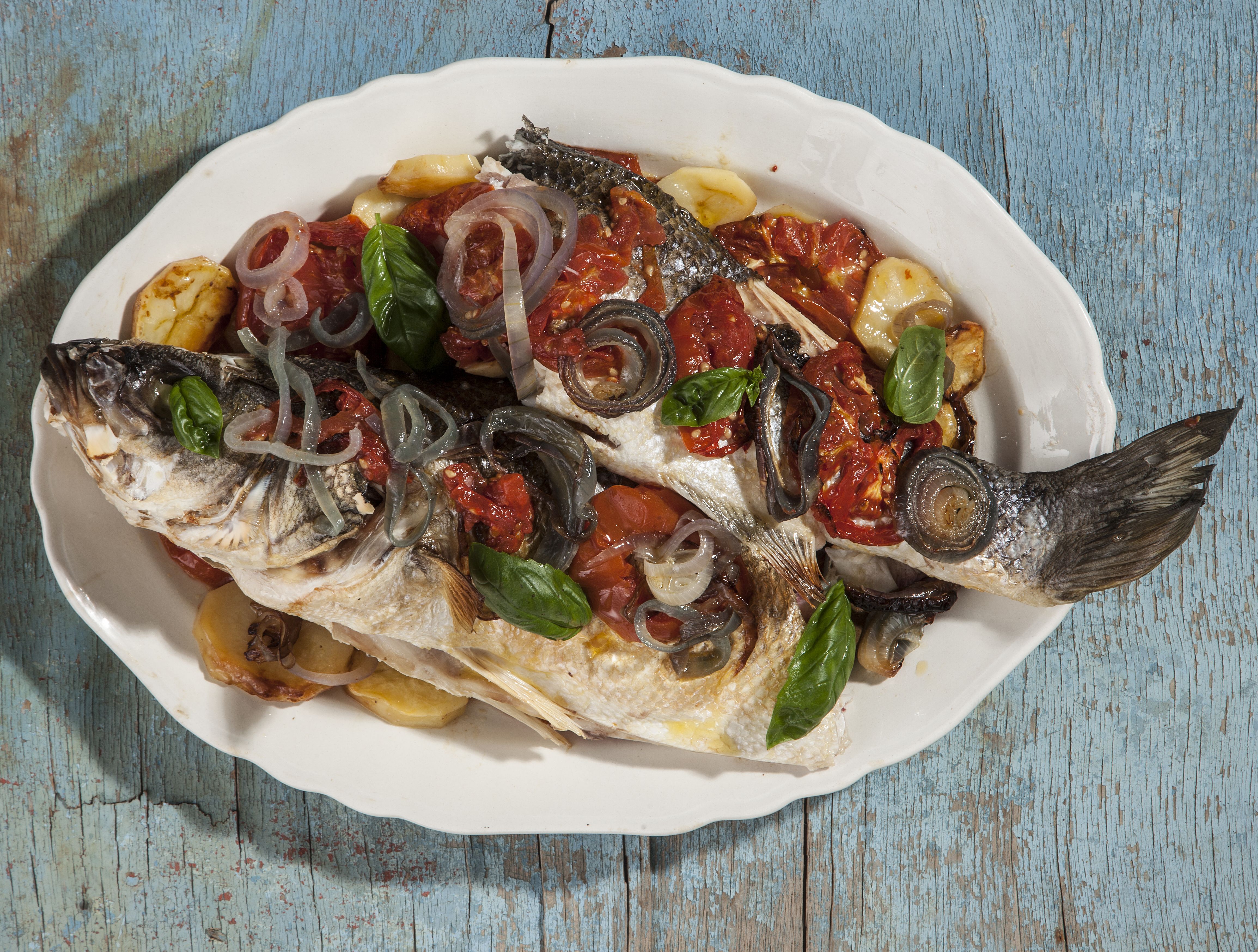 Προθερμαίνουμε τον φούρνο στους 180°C. Αλατοπιπερώνουμε εξωτερικά το ψάρι, αλλά και μέσα στην κοιλιά του. Αλατοπιπερώνουμε τις πατάτες, τα κρεμμύδια και τις ντομάτες. Ρίχνουμε σε ένα μεγάλο ταψί τη μισή ποσότητα από το ελαιόλαδο και βάζουμε το ψάρι στο κέντρο. Τριγύρω βάζουμε τις πατάτες. Από πάνω ρίχνουμε διάσπαρτα τα κλωνάρια βασιλικού με τα φύλλα δάφνης και στη συνέχεια τις ροδέλες κρεμμυδιού. Τέλος, καλύπτουμε με τις ροδέλες ντομάτας. Περιχύνουμε με το υπόλοιπο ελαιόλαδο και το κρασί. Ψήνουμε για 45 λεπτά με 1 ώρα, ανάλογα με το πόσο δυνατός είναι ο φούρνος μας.