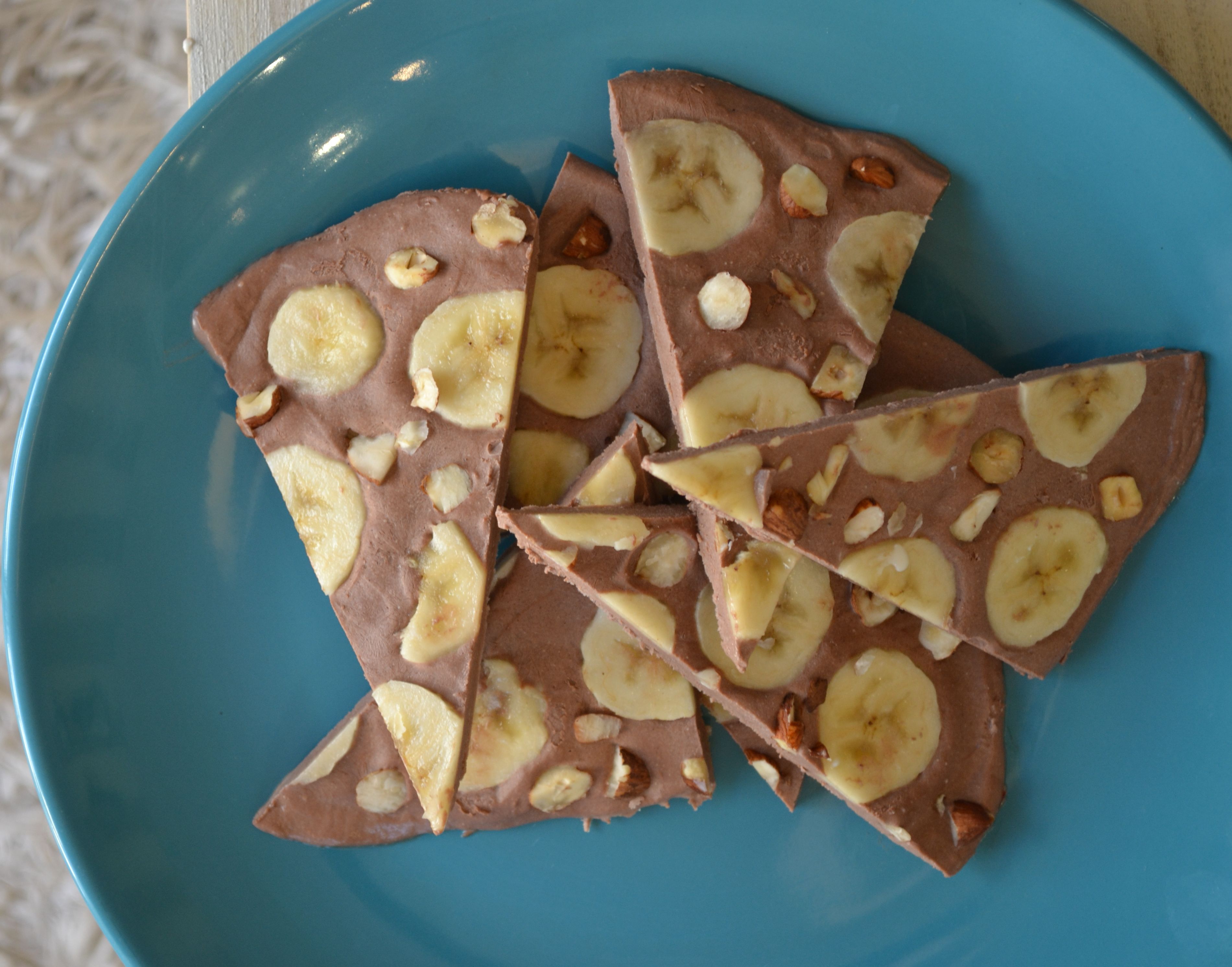 Βυθίζουμε στην επιφάνεια του γιαουρτιού τα φουντούκια και τις ροδέλες μπανάνας.