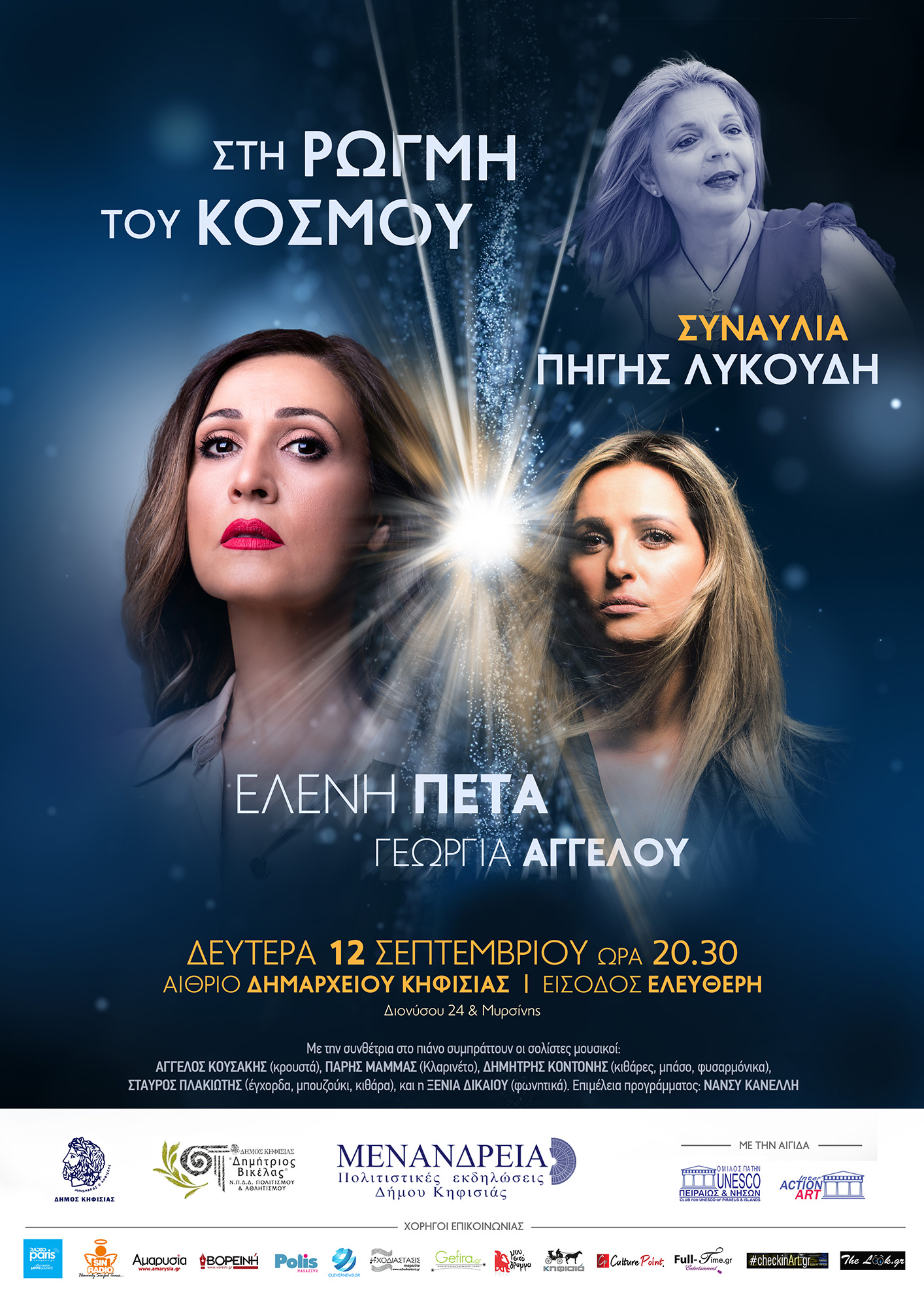 στο πλαίσιο του φεστιβάλ «ΜΕΝΑΝΔΡΕΙΑ» Κηφισιάς απόψε στο στο Αίθριο του Δημαρχείου Κηφισιάς (Διονύσου & Μυρσίνης, 20:30). Η συνθέτρια, δίνει πνοή στα λόγια ελλήνων ποιητών, τα οποία ερμηνεύει η Ελένη Πέτα, ενώ το πρόγραμμα συμπληρώνεται με έργα της Πηγής Λυκούδη, αλλά και άλλων ελλήνων συνθετών. Τραγουδά επίσης η Γεωργία Αγγέλου.