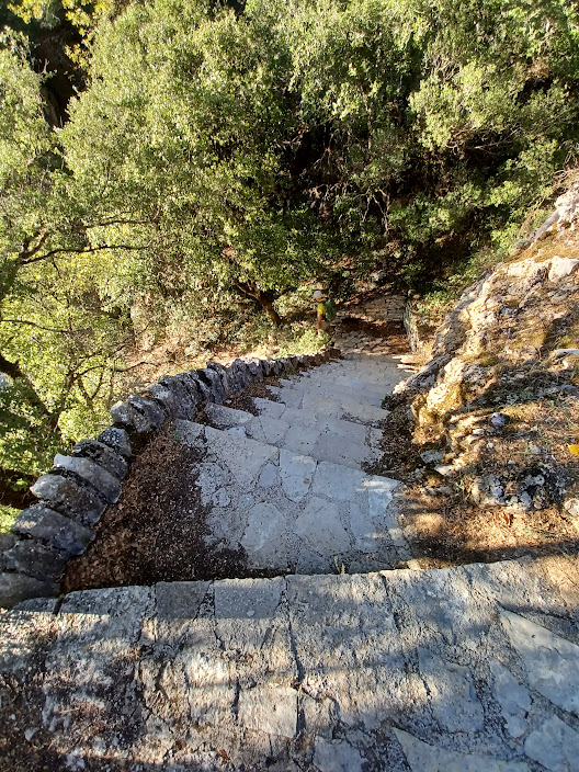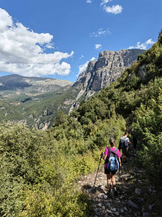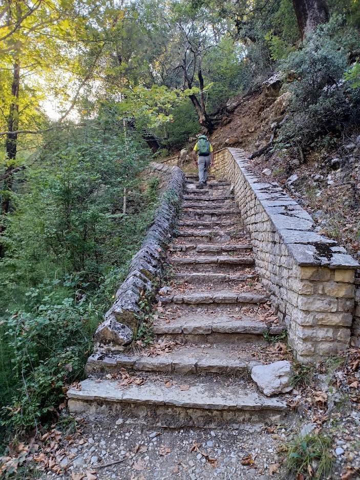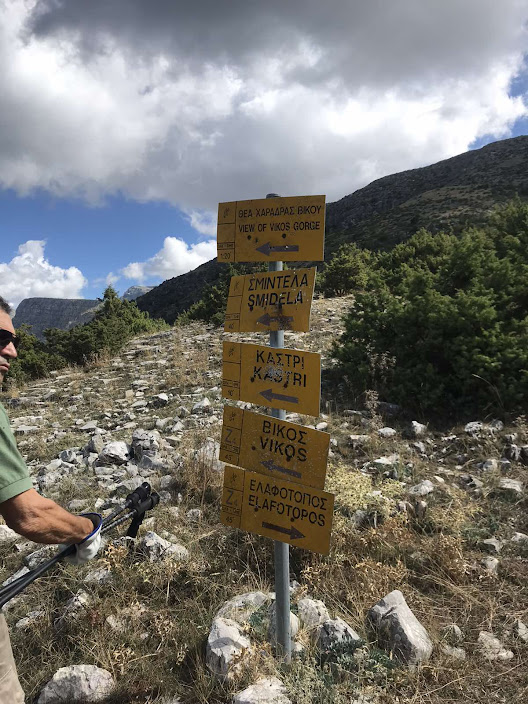 Το κατηφορίζουμε με προορισμό το χωριό Βίκος. Προχωρούμε προσεκτικά γιατί τα μικρά πετραδάκια που είναι σπαρμένα στο μονοπάτι στριφογυρνούν κάτω από τα άρβυλά μας. Κάποιοι από εμάς έχουμε μικρές και ανώδυνες πτώσεις.