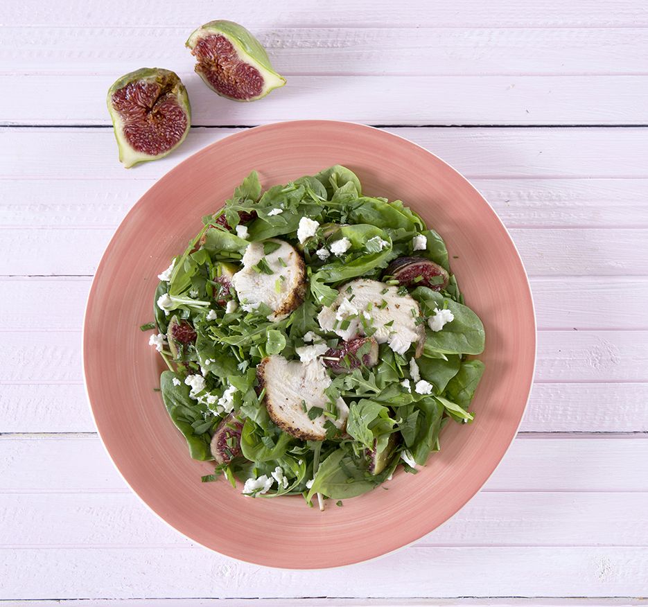 Σαλάτα: Κόβουμε το κοτόπουλο σε λεπτές λωρίδες και το ρίχνουμε σε μια σαλατιέρα μαζί με το σπανάκι, τη ρόκα, το σχοινόπρασο, τον μαϊντανό και τα σύκα. Περιχύνουμε με τη σος και ανακατεύουμε καλά. Πασπαλίζουμε από πάνω με την τριμμένη φέτα.
