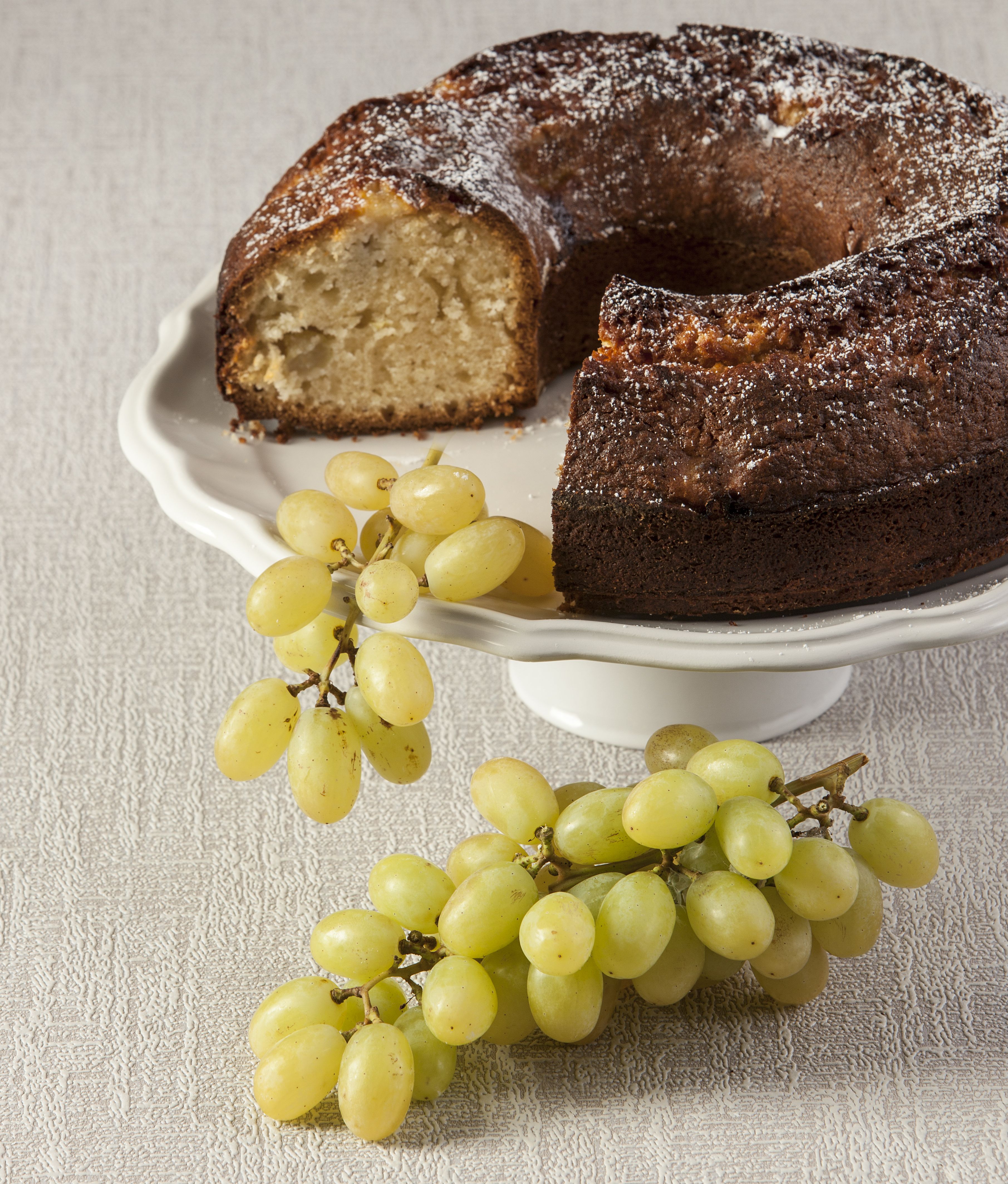 Προθερμαίνουμε τον φούρνο στους 180°C. Χτυπάμε καλά στο μίξερ τα αβγά με τη ζάχαρη άχνη να αφρατέψουν. Προσθέτουμε σιγά-σιγά το σπορέλαιο. Αναμειγνύουμε σε ένα μπολ το αλεύρι με το μπέικιν πάουντερ. Χαμηλώνουμε την ταχύτητα του μίξερ και προσθέτουμε τη σκόνη αμυγδάλου και κατόπιν εναλλάξ το γιαούρτι με το αλεύρι και το μπέικιν πάουντερ. Βάζουμε τις ρώγες του σταφυλιού σε ένα μπολ και τις ανακατεύουμε με τη 1 κ.σ. αλεύρι. Λαδώνουμε και αλευρώνουμε καλά μια μεσαία φόρμα για κέικ. Αδειάζουμε το μείγμα του κέικ στη φόρμα. Βάζουμε από πάνω τις ρώγες και τις πιέζουμε ελαφρά να μπουν λίγο στο μείγμα. Ψήνουμε για 50-55 λεπτά.
