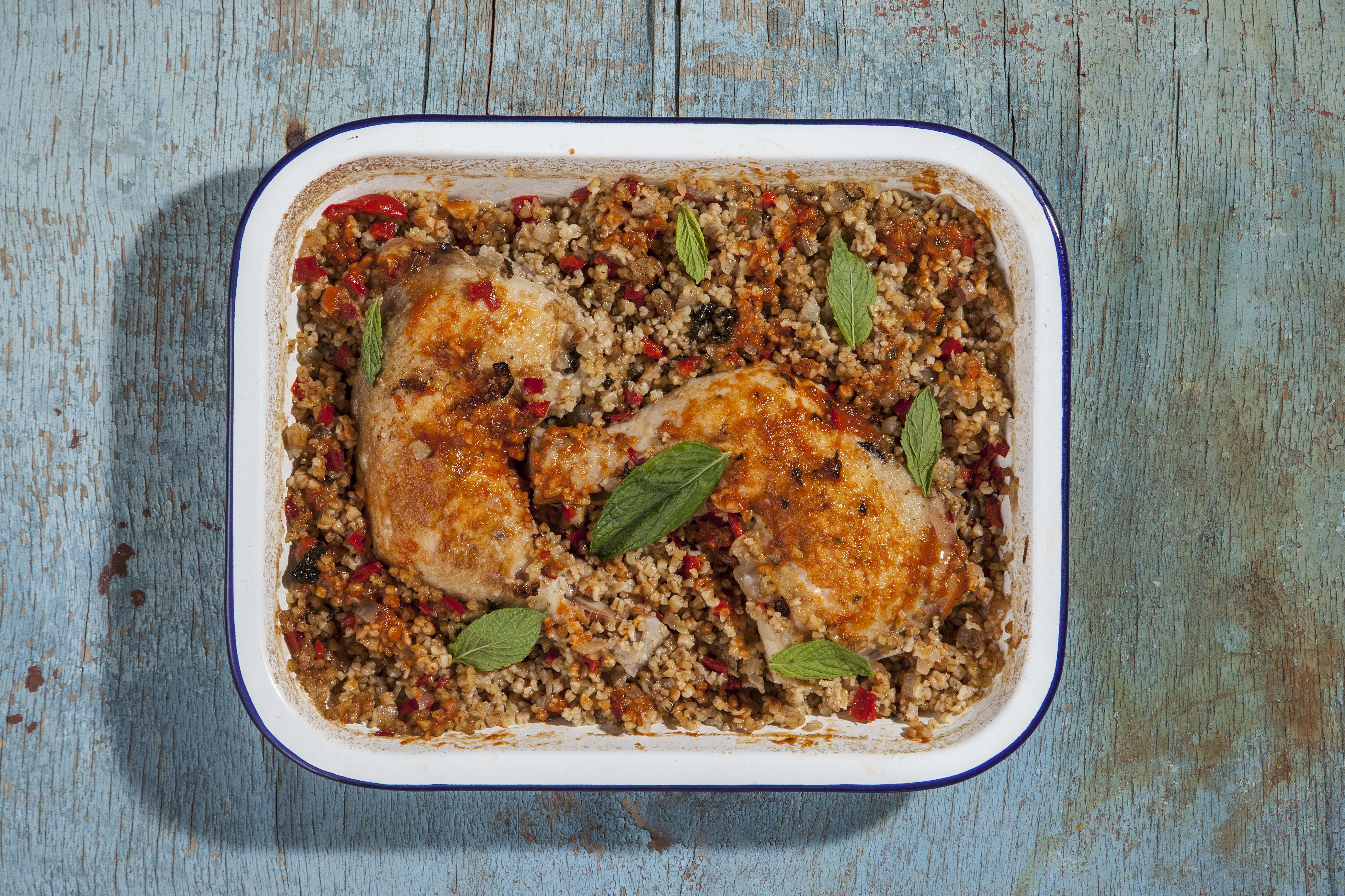 Προθερμαίνουμε τον φούρνο στους 180°C. Σοτάρουμε σε ένα τηγάνι το κρεμμύδι με το υπόλοιπο ελαιόλαδο. Μόλις μαλακώσει προσθέτουμε το πλιγούρι και το ανακατεύουμε για 1 λεπτό. Στη συνέχεια βάζουμε το κοτόπουλο σε ένα ταψί, μαζί με το ζουμί και το σοταρισμένο πλιγούρι τα ανακατεύουμε καλά και ψήνουμε για 40-45 λεπτά. Μόλις το βγάλουμε από τον φούρνο απλώνουμε μια πετσέτα πάνω από το ταψί για να μη στεγνώσει.