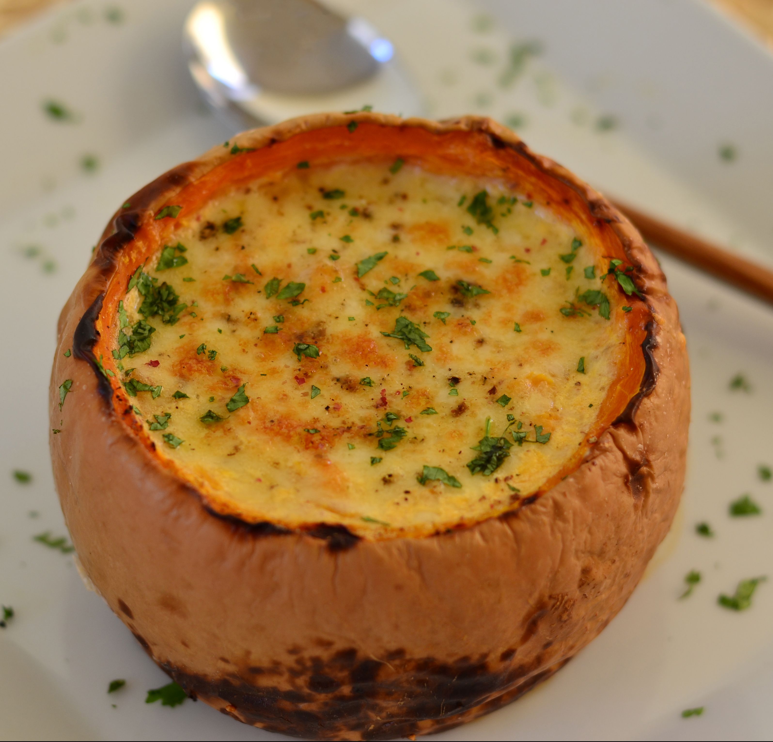 Προθερμαίνουμε τον φούρνο στους 190°C. Κόβουμε τις 2 άκρες της μακρόστενης κολοκύθας (περίπου 15 εκ. από την κάθε πλευρά) και χρησιμοποιούμε αυτό με τη μεγαλύτερη διάμετρο (ή και τα δύο) για να γεμίσουμε. Αφαιρούμε τα κουκούτσια από τη μέση και σκαλίζουμε το εσωτερικό της με ένα μαχαιράκι. Αλατοπιπερώνουμε. Καλύπτουμε με λαδόκολλα και ψήνουμε για 40-45 λεπτά. Αναμειγνύουμε σε ένα μπολ τα τυριά, το μπέικον, τη σκόνη σκόρδου και πιπέρι. Βγάζουμε την κολοκύθα από τον φούρνο και τη γεμίζουμε με το μείγμα του μπολ. Βάζουμε την κολοκύθα και πάλι στον φούρνο για περίπου 20 λεπτά. Την αφήνουμε να κρυώσει για περίπου 30 λεπτά και γαρνίρουμε με φρέσκο μαϊντανό.