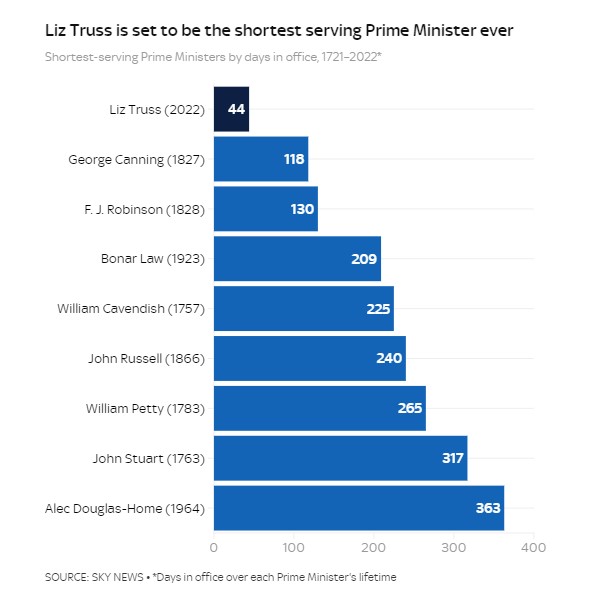 Η Λιζ Τρας παραιτήθηκε σήμερα από την πρωθυπουργία, 44 ημέρες μετά την έναρξη της θητείας της, και καθίσταται η πρωθυπουργός με την πλέον βραχύβια θητεία στη βρετανική ιστορία.
