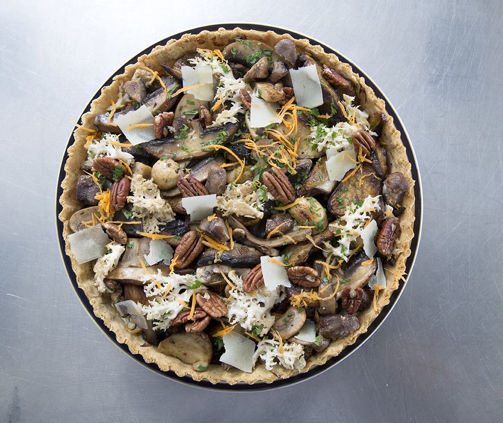 Βγάζουμε την τάρτα από τον φούρνο, ρίχνουμε από πάνω τα σοταρισμένα μανιτάρια με τα υπόλοιπα κάστανα και γαρνίρουμε με λίγο ψιλοκομμένο μαϊντανό, πεκάν ή καρύδια και φλοίδες από γραβιέρα.