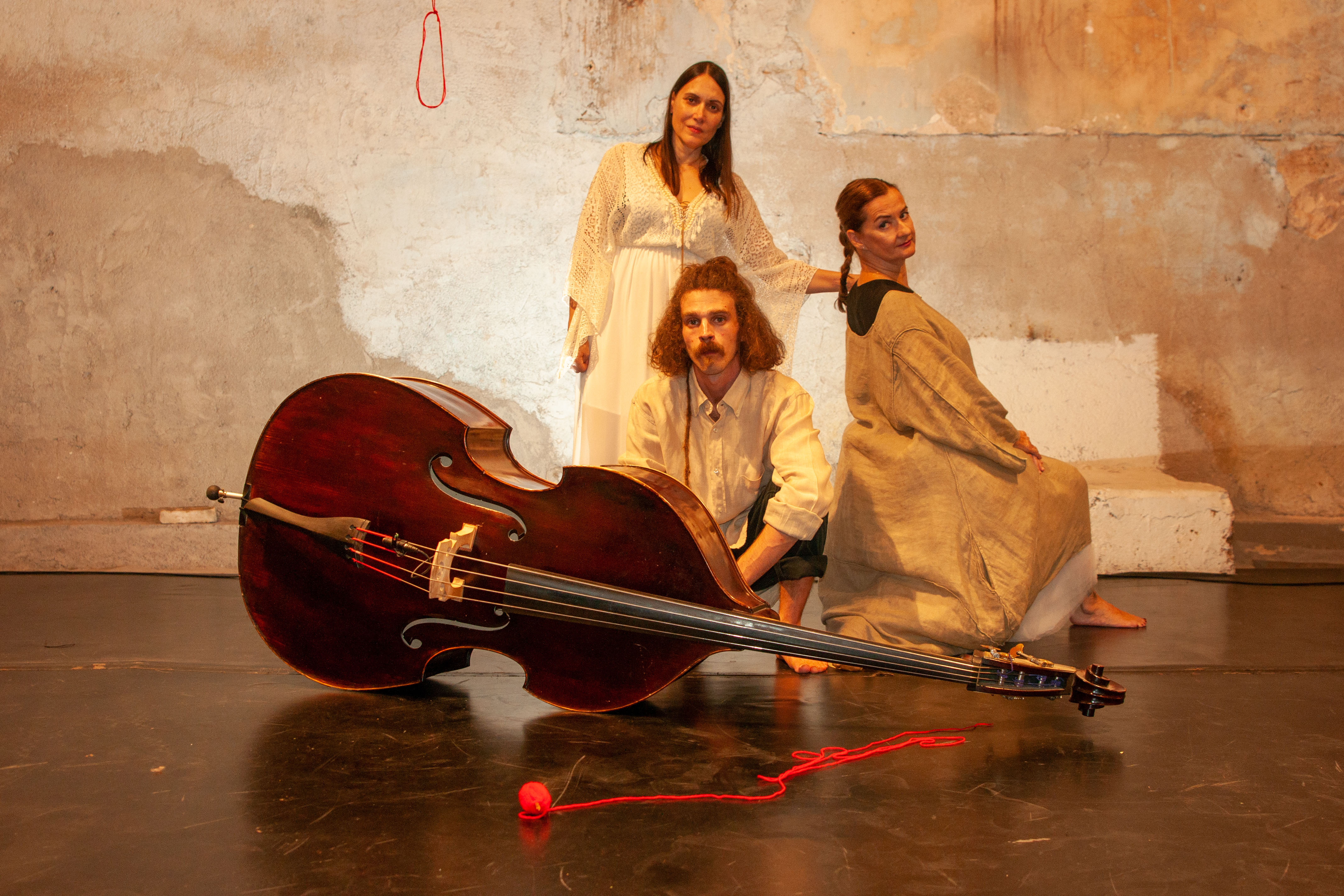 Ελευθερία Ρίζου: «Όπως πάντα, στο Σώμα. Το Σώμα που αισθάνεται, που αλλάζει, που θυμάται, που λυπάται και χαίρεται, που αποφασίζει, που επικοινωνεί. Και στην επικοινωνία, σε ένα δεύτερο επίπεδο, βαθύ και ονειρικό, κοινό τόπο όλων των ανθρώπων όταν σωπαίνει ο νους. Έναν τόπο προλεκτικό, αρχέγονο. Εκεί βαθιά βρίσκονται οι ρίζες του έργου. Κάποια στιγμή ένιωσα την ανάγκη να πάρω ανάσα, να βουτήξω στα σκοτεινά νερά μου και να αναδυθώ. Η «Κόκκινη κλωστή» είναι η ‘ψαριά’ αυτής της βαθιάς κατάδυσης.»