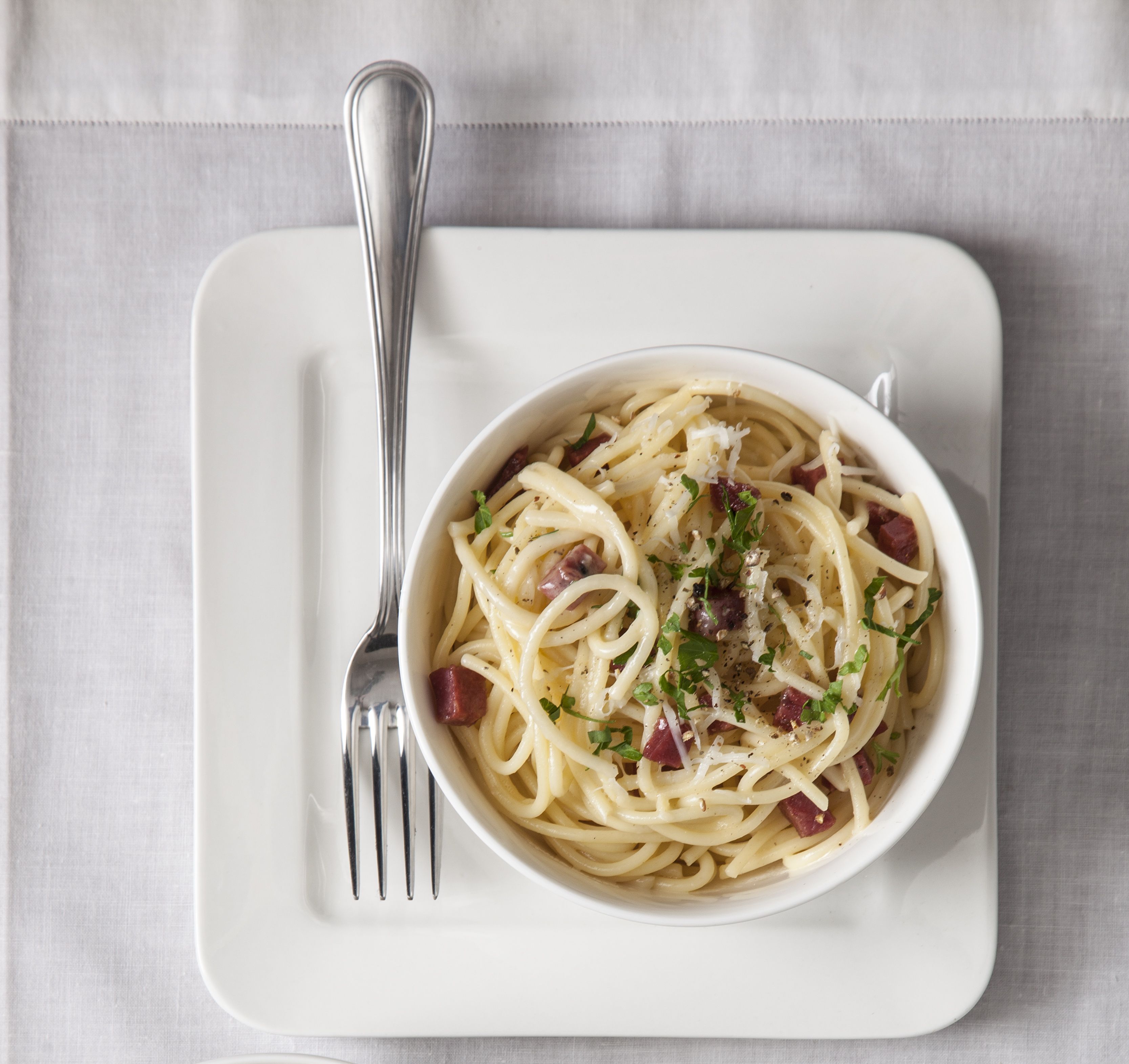 Σε ένα τηγάνι αρκετά μεγάλο για να χωρέσει τα ζυμαρικά ή σε μια κατσαρόλα, ρίχνουμε τους κύβους από το σαλάμι και το βάζουμε σε μέτρια φωτιά. Πρέπει να έρθει σταδιακά σε θερμοκρασία για να λιώσει το λίπος του χωρίς να καεί, να απελευθερώσει τα αρώματα, τη γεύση του και να γίνει ελαφρά τραγανό.