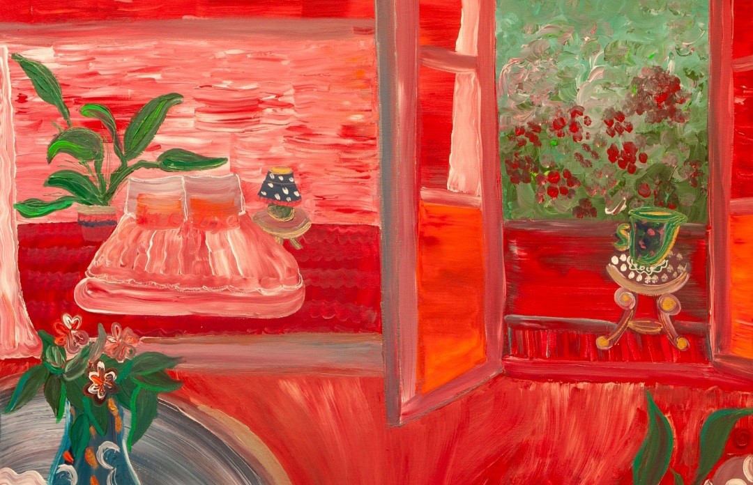 Παράλληλα η εικαστικός παρουσιάζει και εσωτερικά τοπία από τα οποία επίσης αναβλύζει μία διάχυτη ευδαιμονία με την ένταση των φωτεινών, θερμών χρωμάτων να κορυφώνεται και τα επιμέρους στοιχεία – τα άνθη, τα φωτεινά παράθυρα με τα ελκυστικά τοπία και άλλες διακοσμητικές αναφορές να γίνονται οι πρωταγωνιστές της σύνθεσης.