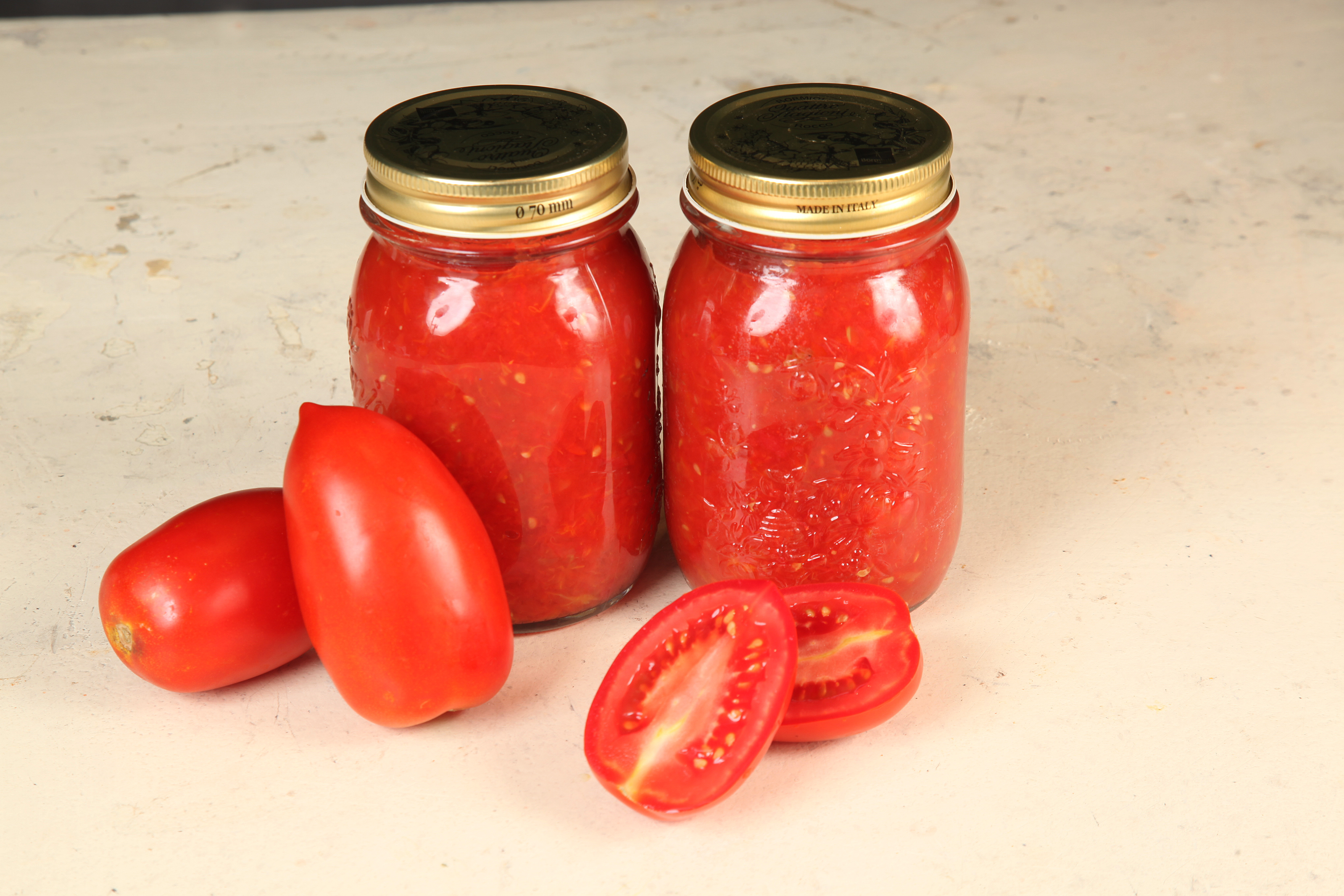Προσθέτουμε αλάτι και ξεκινάμε να μαγειρεύουμε σε χαμηλή φωτιά. Ανακατεύουμε κάθε τόσο για να μην πιάσει στην κατσαρόλα. Είναι καλύτερο να μη βάλουμε σε αυτή τη φάση μυρωδικά και μπαχαρικά – είναι προτιμότερο να τα προσθέσουμε όταν ανοίξουμε το βάζο και μαγειρέψουμε όποιο φαγητό θέλουμε με τη σάλτσα. Μαγειρεύουμε για τουλάχιστον 1 ώρα.