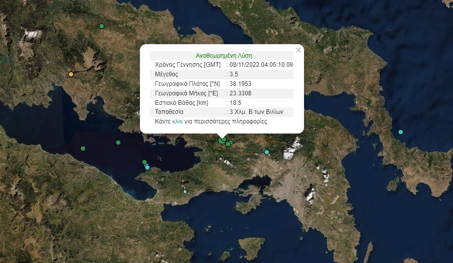 Σύμφωνα με το Γεωδυναμικό Ινστιτούτο, το επίκεντρο του σεισμού βρίσκεται τρία χλμ βόρεια των Βιλίων Αττικής.