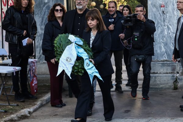 Η Πρόεδρος της Δημοκρατίας Κατερίνα Σακελλαροπούλου κατέθεσε στεφάνι σήμερα το πρωί στο Πολυτεχνείο για τον εορτασμό της 49ης επετείου από την εξέγερση κατά της δικτατορίας των συνταγματαρχών.