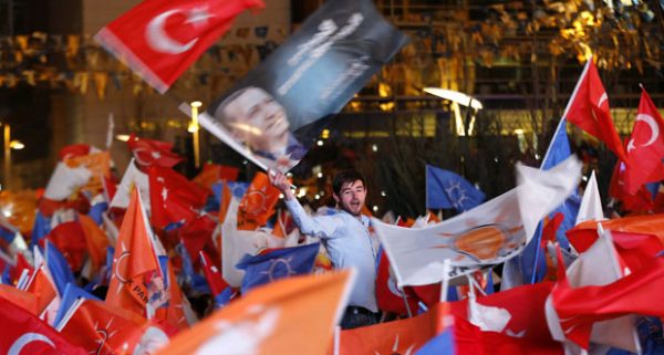 Υποστηρικτές του Ερντογάν έξω από την έδρα του κυβερνώντος κόμματος στην Αγκυρα (φωτογραφία Umit Bektas/Reuters)