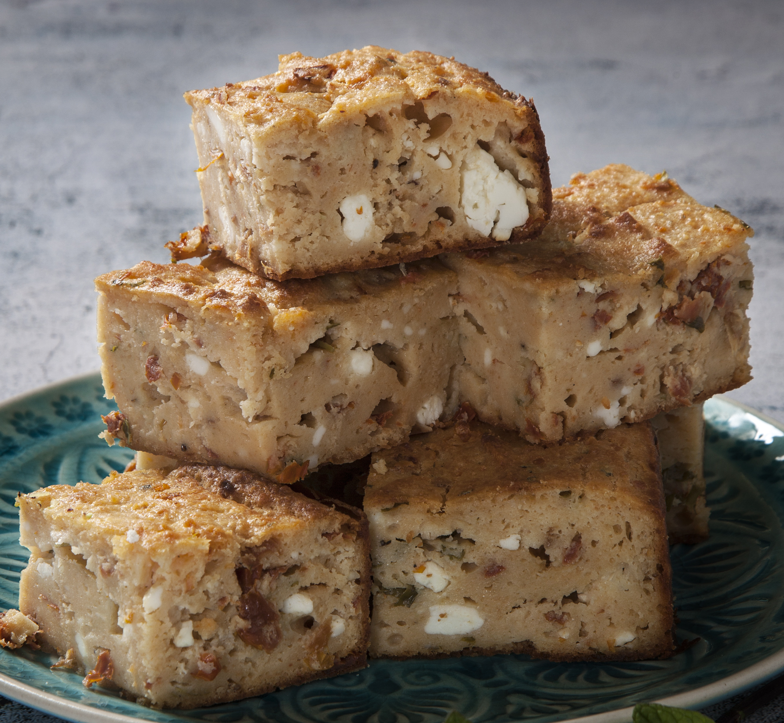 Προθερμαίνουμε τον φούρνο στους 180°C. Χτυπάμε στο μίξερ το αλεύρι με το βούτυρο μέχρι να αφρατέψουν, 3-4 λεπτά. Προσθέτουμε τα αβγά και χαμηλώνουμε την ταχύτητα. Σταματάμε το χτύπημα και προσθέτουμε το ελαιόλαδο και το κατίκι Δομοκού. Ανακατεύουμε καλά με μια σπάτουλα. Ενσωματώνουμε τα υπόλοιπα τυριά, ανακατεύοντας απαλά, και στη συνέχεια όλα τα υπόλοιπα υλικά. Βουτυρώνουμε και αλευρώνουμε ένα ταψί και αδειάζουμε εκεί το μείγμα. Ψήνουμε για 35-45 λεπτά. Βυθίζουμε στο κέντρο του κέικ μια οδοντογλυφίδα ή ένα μαχαίρι. Αν βγουν στεγνά, χωρίς υπολείμματα νωπής ζύμης, το βγάζουμε από τον φούρνο, αλλιώς ψήνουμε για 5 λεπτά ακόμη και ξαναδοκιμάζουμε. Ξεφορμάρουμε το κέικ πάνω σε μια σχάρα με ποδαράκι ώστε να κρυώσει ομοιόμορφα. Γκίκας Ξενάκης