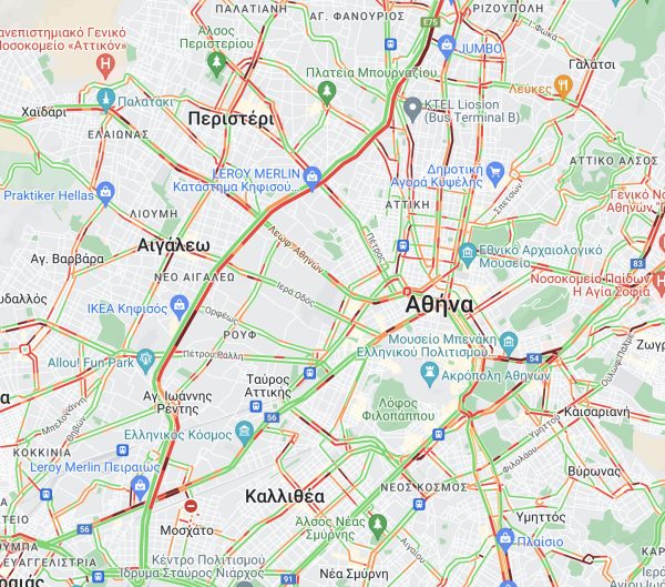 Συγκεκριμένα στη 1 το μεσημέρι της Παρασκευής καταγράφονταν καθυστερήσεις 20΄-25΄ από κόμβο Κηφισίας έως κόμβο Μεταμόρφωσης (έξοδο για Λαμία) στο ρεύμα προς Ελευσίνα και καθυστερήσεις 10΄-15΄στην έξοδο για Λαμία στο ρεύμα προς Αεροδρόμιο.